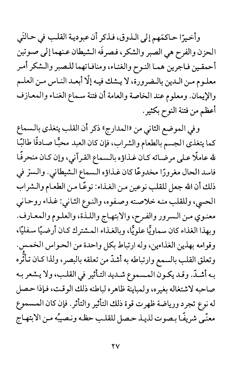 وفي الموضع الثاني من "المدارج" ذكر أن القلب يتغذى بالسماع كما يتغذى الجسم بالطعام والشراب، فإن كان العبد محبًّا صادقًا طالبًا لله عاملًا على مرضاته كان غذاؤه بالسماع القرآني، وإن كان منحرفًا فاسد الحال مغرورًا مخدوعًا كان غذاؤه السماع الشيطاني. والسرّ في ذلك أن الله جعل للقلب نوعين من الغذاء: نوعًا من الطعام والشراب الحسي، وللقلب منه خلاصته وصفوه، والنوع الثاني: غذاء روحاني معنوي من السرور والفرح، والابتهاج واللذة، والعلوم والمعارف. وبهذا الغذاء كان سماويًّا علويًّا، وبالغذاء المشترك كان أرضيًا سفليًا، وقوامه بهذين الغذاءين، وله ارتباط بكل واحدة من الحواس الخمس. وتعلق القلب بالسمع وارتباطه به أشدّ من تعلقه بالبصر، ولذا كان تأثُّره به أشدّ. وقد يكون المسموع شديد التأثير في القلب، ولا يشعر به صاحبه لاشتغاله بغيره، ولمباينة ظاهره لباطنه ذلك الوقت، فإذا حصل له نوع تجرد ورياضة ظهرت قوة ذلك التأثير والتأثر. فإن كان المسموع معنًى شريفًا بصوت لذيذ حصل للقلب حظه ونصيبُه من الابتهاج
