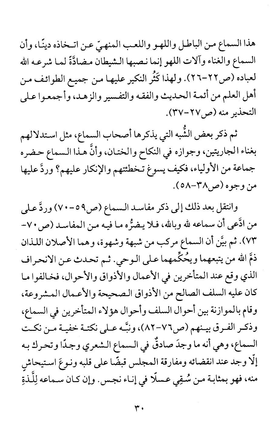هذا السماع من الباطل واللهو واللعب المنهيّ عن اتخاذه دينًا، وأن السماع والغناء وآلات اللهو إنما نصبها الشيطان مضادَّةً لما شرعه الله لعباده (ص 22 - 26). ولهذا كَثُر النكير عليها من جميع الطوائف من أهل العلم من أئمة الحديث والفقه والتفسير والزهد، وأجمعوا على التحذير منه (ص 27 - 37).