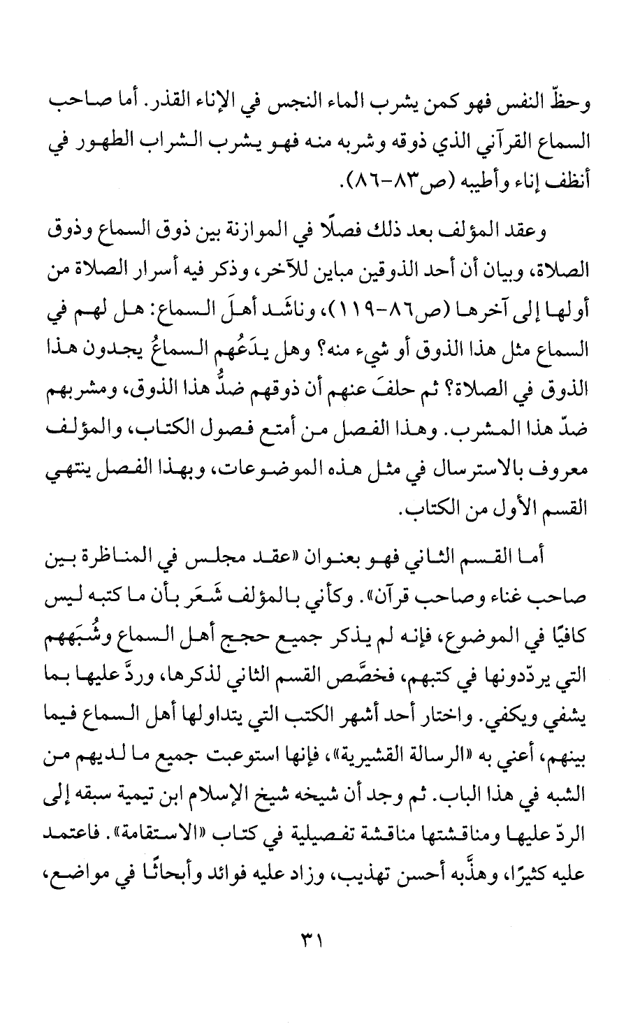 وعقد المؤلف بعد ذلك فصلًا في الموازنة بين ذوق السماع وذوق الصلاة، وبيان أن أحد الذوقين مباين للآخر، وذكر فيه أسرار الصلاة من أولها إلى آخرها (ص 86 - 119)، وناشَد أهلَ السماع: هل لهم في السماع مثل هذا الذوق أو شيء منه؟ وهل يدَعُهم السماعُ يجدون هذا الذوق في الصلاة؟ ثم حلفَ عنهم أن ذوقهم ضدُّ هذا الذوق، ومشربهم ضدّ هذا المشرب. وهذا الفصل من أمتع فصول الكتاب، والمؤلف معروف بالاسترسال في مثل هذه الموضوعات، وبهذا الفصل ينتهي القسم الأول من الكتاب.