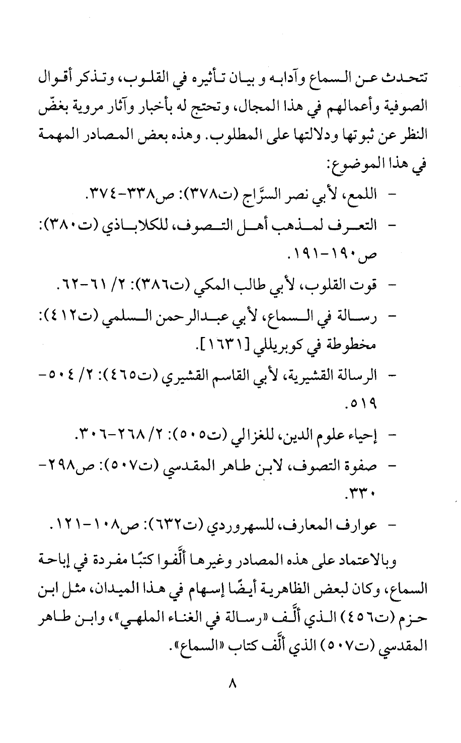 تتحدث عن السماع وآدابه وبيان تأثيره في القلوب، وتذكر أقوال الصوفية وأعمالهم في هذا المجال، وتحتج له بأخبار وآثار مروية بغضّ النظر عن ثبوتها ودلالتها على المطلوب. وهذه بعض المصادر المهمة في هذا الموضوع: