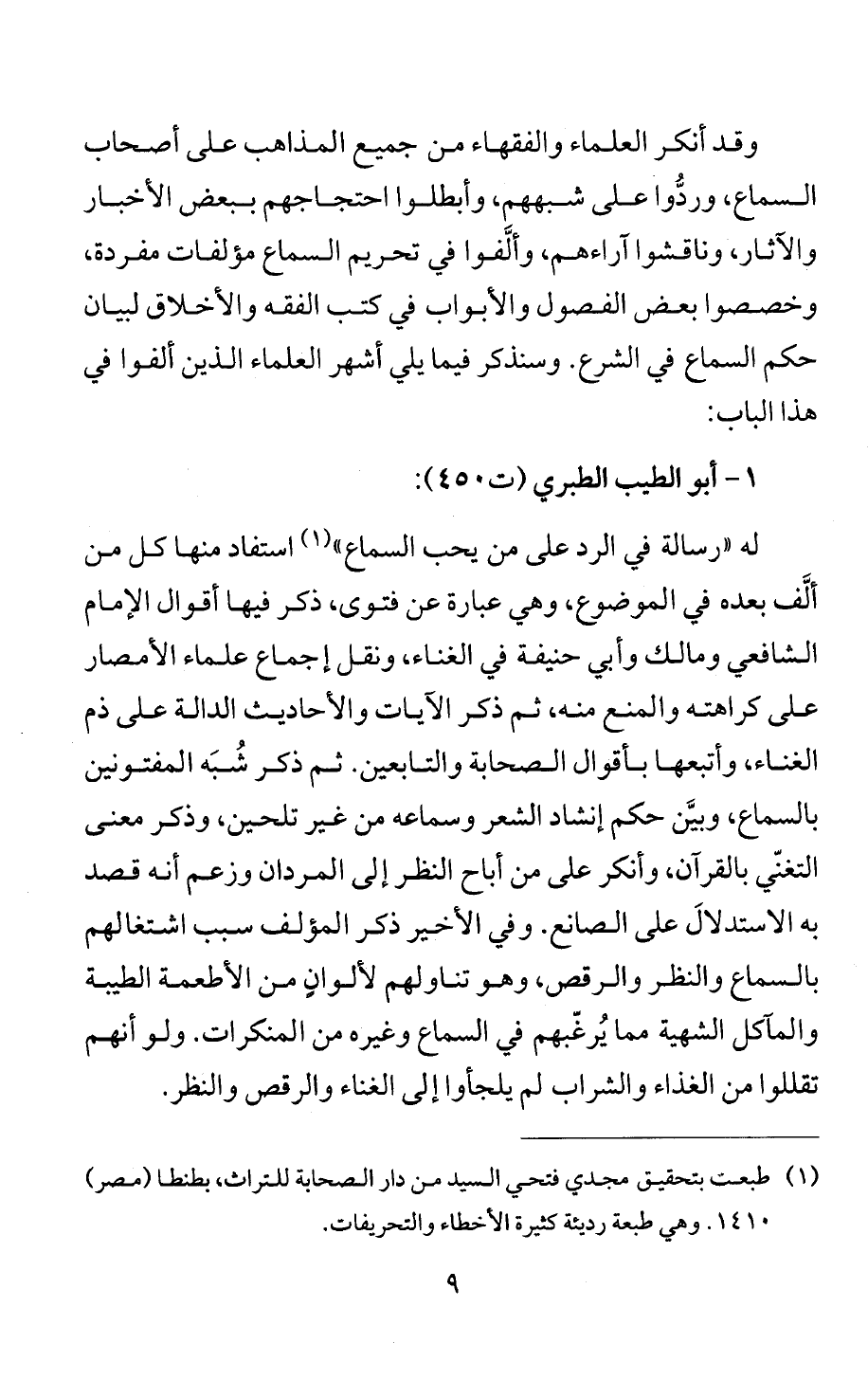له "رسالة في الرد على من يحب السماع" (¬1) استفاد منها كل من ألَّف بعده في الموضوع، وهي عبارة عن فتوى، ذكر فيها أقوال الإمام الشافعي ومالك وأبي حنيفة في الغناء، ونقل إجماع علماء الأمصار على كراهته والمنع منه، ثم ذكر الآيات والأحاديث الدالة على ذم الغناء، وأتبعها بأقوال الصحابة والتابعين. ثم ذكر شُبَه المفتونين بالسماع، وبيَّن حكم إنشاد الشعر وسماعه من غير تلحين، وذكر معنى التغنّي بالقرآن، وأنكر على من أباح النظر إلى المردان وزعم أنه قصد به الاستدلالَ على الصانع. وفي الأخير ذكر المؤلف سبب اشتغالهم بالسماع والنظر والرقص، وهو تناولهم لألوانٍ من الأطعمة الطيبة والمآكل الشهية مما يُرغّبهم في السماع وغيره من المنكرات. ولو أنهم تقللوا من الغذاء والشراب لم يلجأوا إلى الغناء والرقص والنظر.