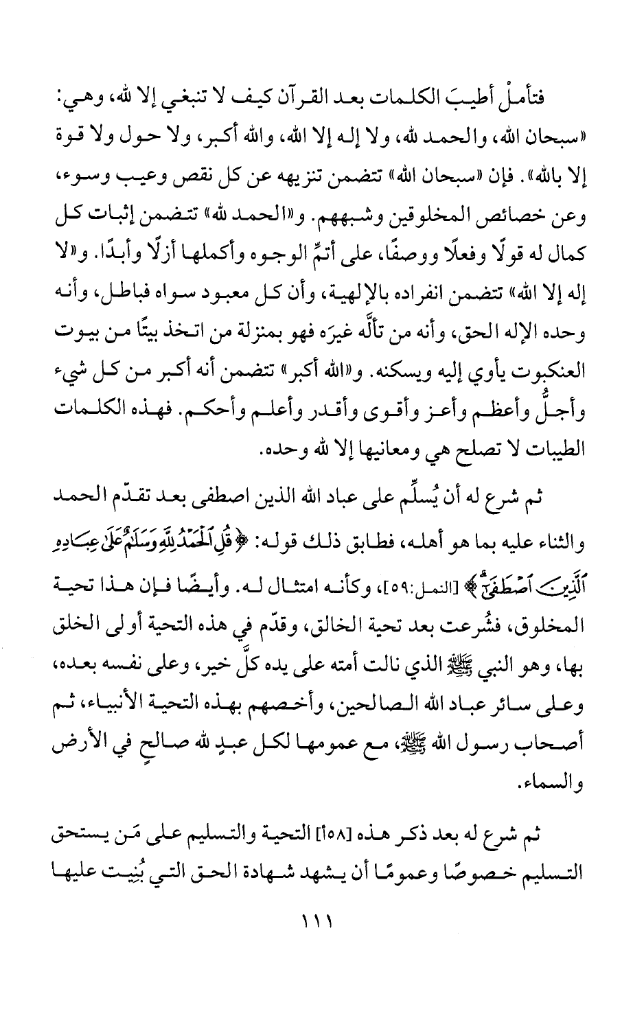 فتأملْ أطيبَ الكلمات بعد القرآن كيف لا تنبغي إلا لله، وهي: "سبحان الله، والحمد لله، ولا إله إلا الله، والله أكبر، ولا حول ولا قوة إلا بالله". فإن "سبحان الله" تتضمن تنزيهه عن كل نقص وعيب وسوء، وعن خصائص المخلوقين وشبههم. و"الحمد لله" تتضمن إثبات كل كمال له قولًا وفعلًا ووصفًا، على أتمِّ الوجوه وأكملها أزلًا وأبدًا. و"لا إله إلا الله" تتضمن انفراده بالإلهية، وأن كل معبود سواه فباطل، وأنه وحده الإله الحق، وأنه من تألَّه غيرَه فهو بمنزلة من اتخذ بيتًا من بيوت العنكبوت يأوي إليه ويسكنه. و"الله أكبر" تتضمن أنه أكبر من كل شيء وأجلُّ وأعظم وأعز وأقوى وأقدر وأعلم وأحكم. فهذه الكلمات الطيبات لا تصلح هي ومعانيها إلا لله وحده.