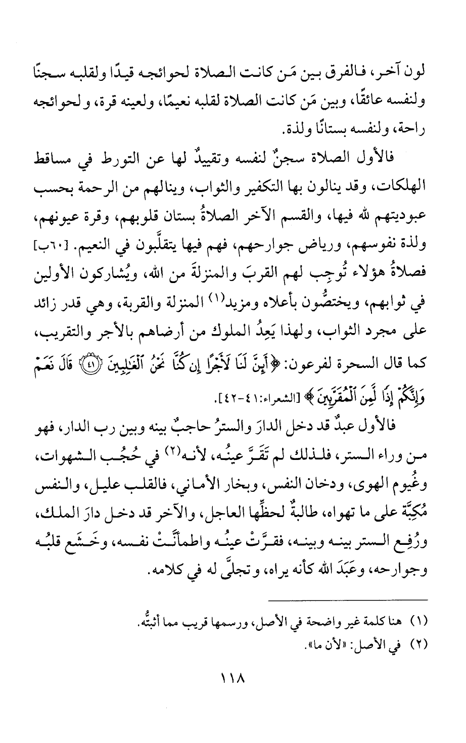 فالأول الصلاة سجنٌ لنفسه وتقييدٌ لها عن التورط في مساقط الهلكات، وقد ينالون بها التكفير والثواب، وينالهم من الرحمة بحسب عبوديتهم لله فيها، والقسم الآخر الصلاةُ بستان قلوبهم، وقرة عيونهم، ولذة نفوسهم، ورياض جوارحهم، فهم فيها يتقلَّبون في النعيم. فصلاةُ هؤلاء تُوجِب لهم القربَ والمنزلةَ من الله، ويُشاركون الأولين في ثوابهم، ويختصُّون بأعلاه ومزيد (¬1) المنزلة والقربة، وهي قدر زائد على مجرد الثواب، ولهذا يَعِدُ الملوك من أرضاهم بالأجر والتقريب، كما قال السحرة لفرعون: {أَئِنَّ لَنَا لَأَجْرًا إِنْ كُنَّا نَحْنُ الْغَالِبِينَ (41) قَالَ نَعَمْ وَإِنَّكُمْ إِذًا لَمِنَ الْمُقَرَّبِينَ} [الشعراء: 41 - 42].
