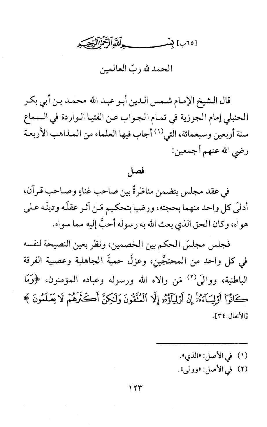 قال الشيخ الإمام شمس الدين أبو عبد الله محمد بن أبي بكر الحنبلي إمام الجوزية في تمام الجواب عن الفتيا الواردة في السماع سنة أربعين وسبعمائة، التي (¬1) أجاب فيها العلماء من المذاهب الأربعة رضي الله عنهم أجمعين:
