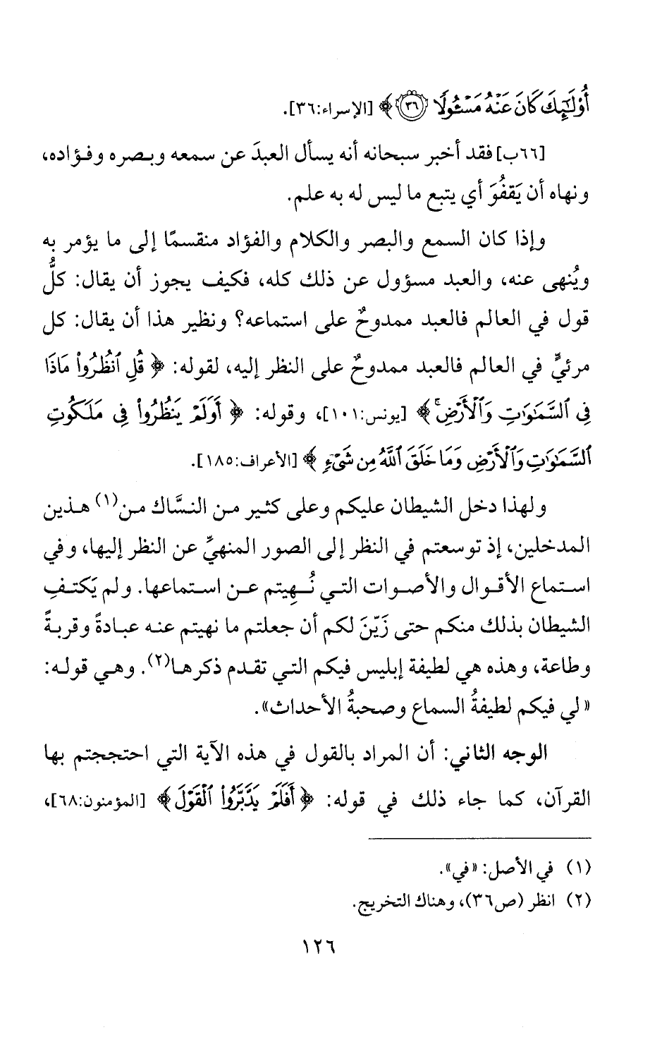 وإذا كان السمع والبصر والكلام والفؤاد منقسمًا إلى ما يؤمر به ويُنهى عنه، والعبد مسؤول عن ذلك كله، فكيف يجوز أن يقال: كلُّ قول في العالم فالعبد ممدوح على استماعه؟ ونظير هذا أن يقال: كل مرئي في العالم فالعبد ممدوح على النظر إليه، لقوله: {قُلِ انْظُرُوا مَاذَا فِي السَّمَاوَاتِ وَالْأَرْضِ} [يونس: 101]، وقوله: {أَوَلَمْ يَنْظُرُوا فِي مَلَكُوتِ السَّمَاوَاتِ وَالْأَرْضِ وَمَا خَلَقَ اللَّهُ مِنْ شَيْءٍ} [الأعراف: 185].