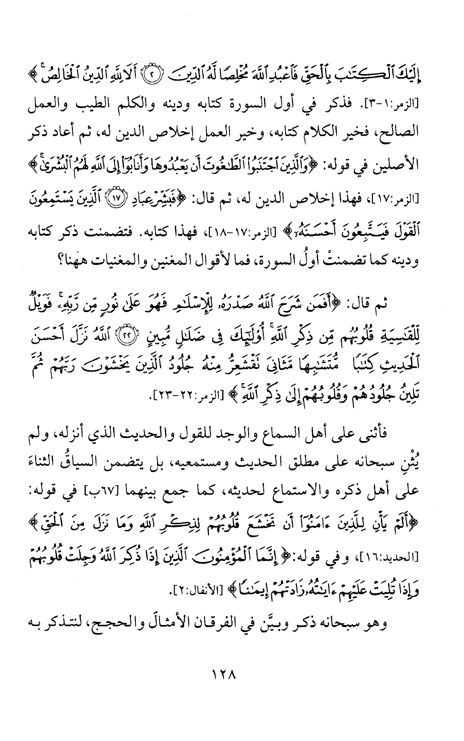 فأثنى على أهل السماع والوجد للقول والحديث الذي أنزله، ولم يُثْنِ سبحانه على مطلق الحديث ومستمعيه، بل يتضمن السياقُ الثناءَ على أهل ذكره والاستماع لحديثه، كما جمع بينهما في قوله: {أَلَمْ يَأْنِ لِلَّذِينَ آمَنُوا أَنْ تَخْشَعَ قُلُوبُهُمْ لِذِكْرِ اللَّهِ وَمَا نَزَلَ مِنَ الْحَقِّ} [الحديد: 16]، وفي قوله: {إِنَّمَا الْمُؤْمِنُونَ الَّذِينَ إِذَا ذُكِرَ اللَّهُ وَجِلَتْ قُلُوبُهُمْ وَإِذَا تُلِيَتْ عَلَيْهِمْ آيَاتُهُ زَادَتْهُمْ إِيمَانًا} [الأنفال: 2].