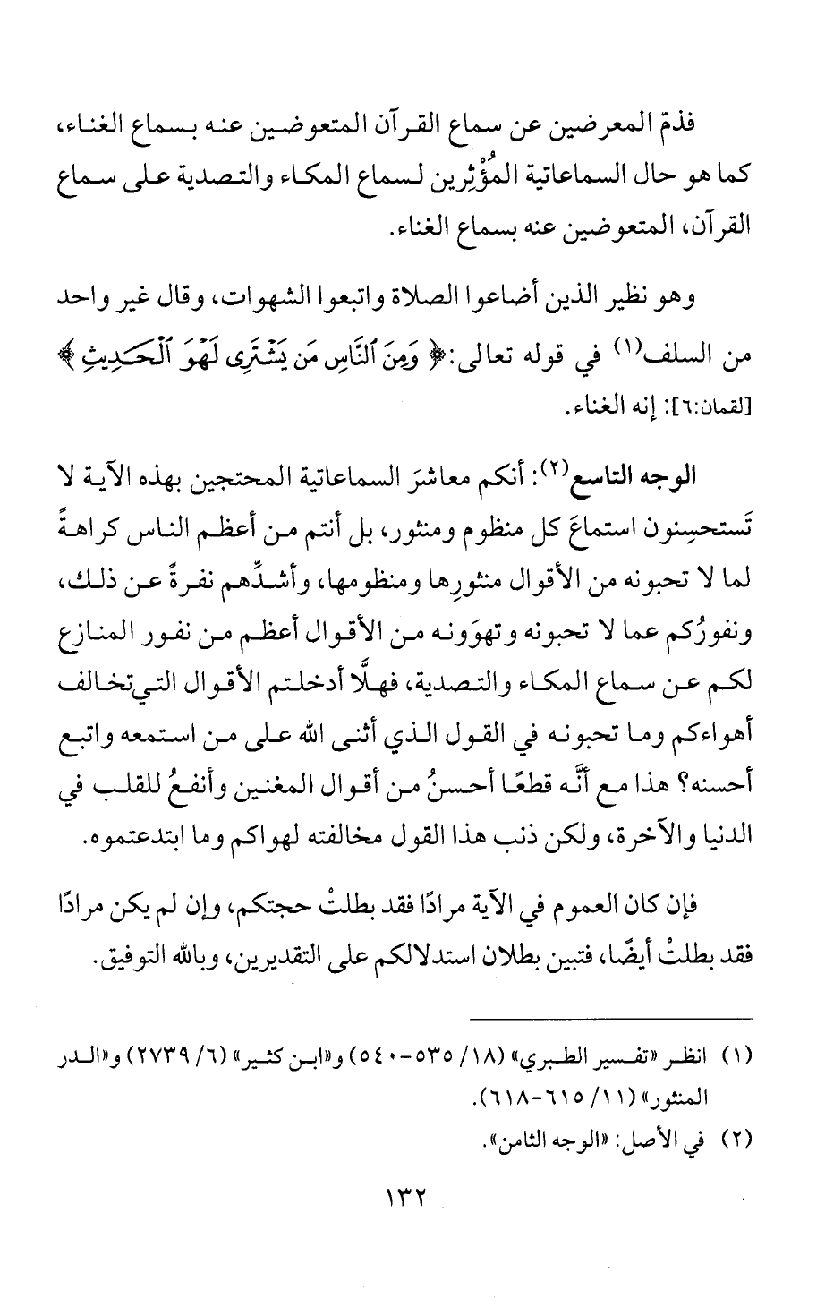 فذمّ المعرضين عن سماع القرآن المتعوضين عنه بسماع الغناء، كما هو حال السماعاتية المُؤْثِرين لسماع المكاء والتصدية على سماع القرآن، المتعوضين عنه بسماع الغناء.