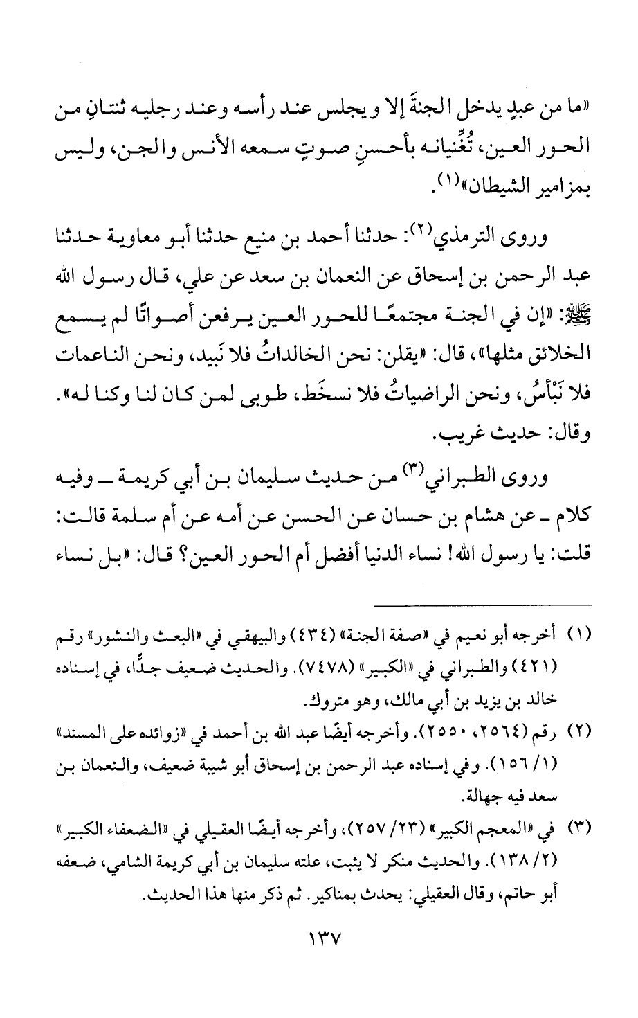 "ما من عبدٍ يدخل الجنةَ إلا ويجلس عند رأسه وعند رجليه ثنتانِ من الحور العين، تُغِّنيانه بأحسنِ صوتٍ سمعه الإنس والجن، وليس بمزامير الشيطان" (¬1).