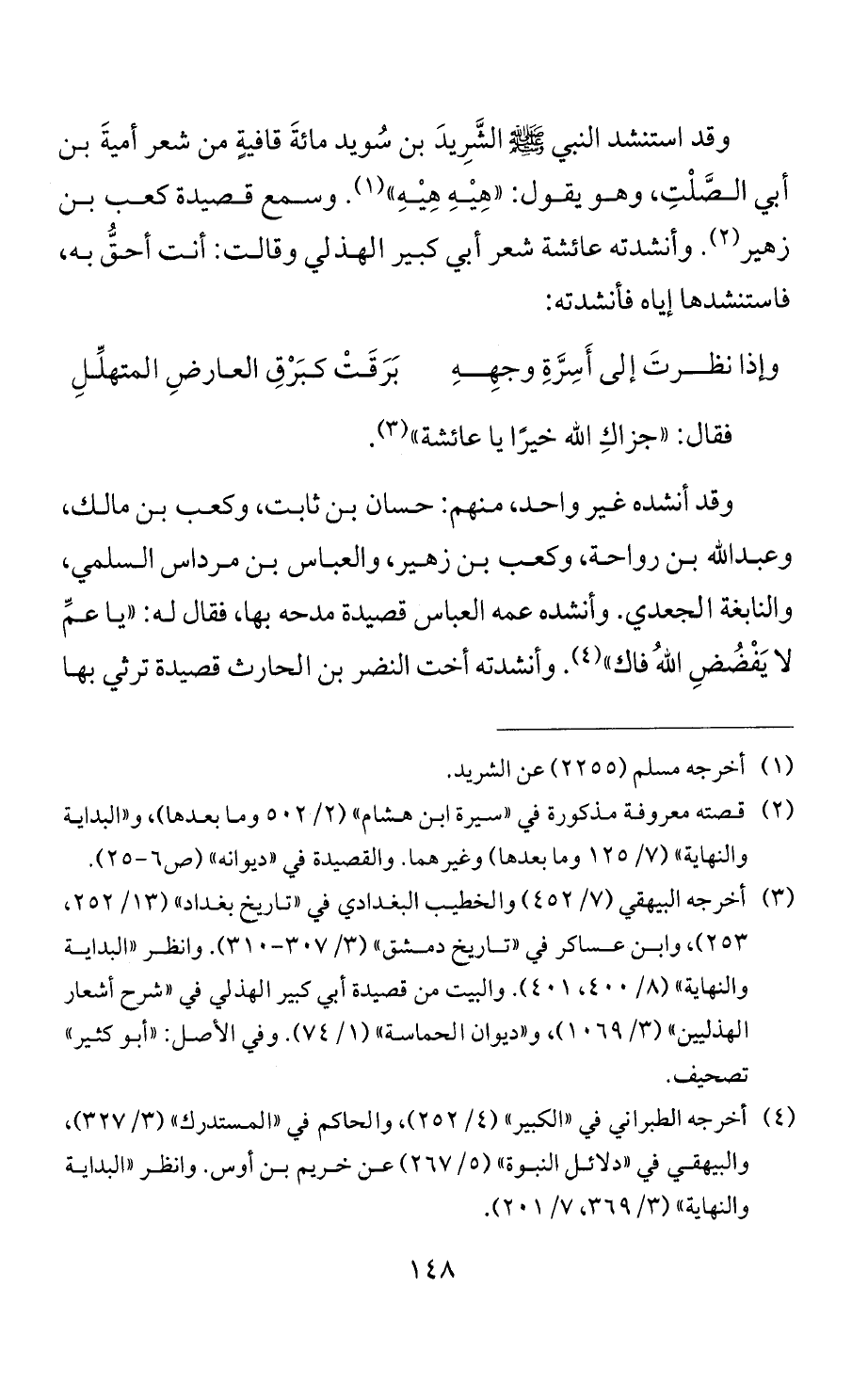 وقد استنشد النبي - صلى الله عليه وسلم - الشَّرِيدَ بن سُويد مائةَ قافيةٍ من شعر أميةَ بن أبي الصَّلْتِ، وهو يقول: "هِيْهِ هِيْهِ" (¬1). وسمع قصيدة كعب بن زهير (¬2). وأنشدته عائشة شعر أبي كبير الهذلي وقالت: أنت أحقُّ به، فاستنشدها إياه فأنشدته: