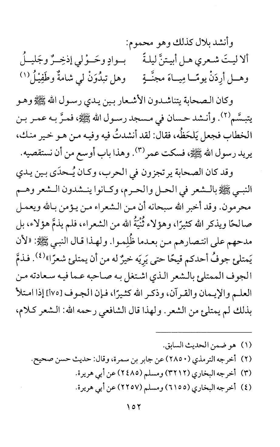 وكان الصحابة يتناشدون الأشعار بين يدي رسول الله - صلى الله عليه وسلم - وهو يتبسَّم (¬2). وأنشد حسان فى مسجد رسول الله - صلى الله عليه وسلم -، فمرَّ به عمر بن الخطاب فجعل يَلحَظُه، فقال: لقد أنشدتُ فيه وفيه من هو خير منك، يريد رسول الله - صلى الله عليه وسلم -، فسكت عمر (¬3). وهذا باب أوسع من أن نستقصيه.