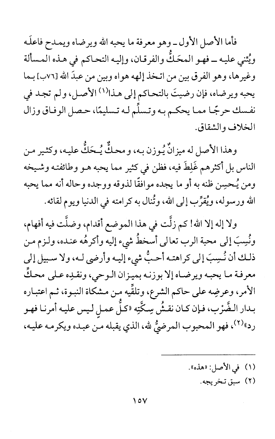 ولا إله إلا الله! كم زلَّت في هذا الموضع أقدام، وضلَّت فيه أفهام، ونُسِبَ إلى محبة الرب تعالى أسخطُ شيء إليه وأكرهُه عنده، ولزم من ذلك أن نُسِبَ إلى كراهته أحبُّ شيء إليه وأرضى له، ولا سبيل إلى معرفة ما يحبه ويرضاه إلا بوزنه بميزان الوحي، ونقدِه على محكِّ الأمر، وعرضِه على حاكم الشرع، وتلقِّيه من مشكاة النبوة، ثم اعتباره بدار الضَّرْب، فإن كان نقشُ سِكَّتِه "كلُّ عملٍ ليس عليه أمرنا فهو رد" (¬2)، فهو المحبوب المرضيُّ لله، الذي يقبله من عبده ويكرمه عليه،