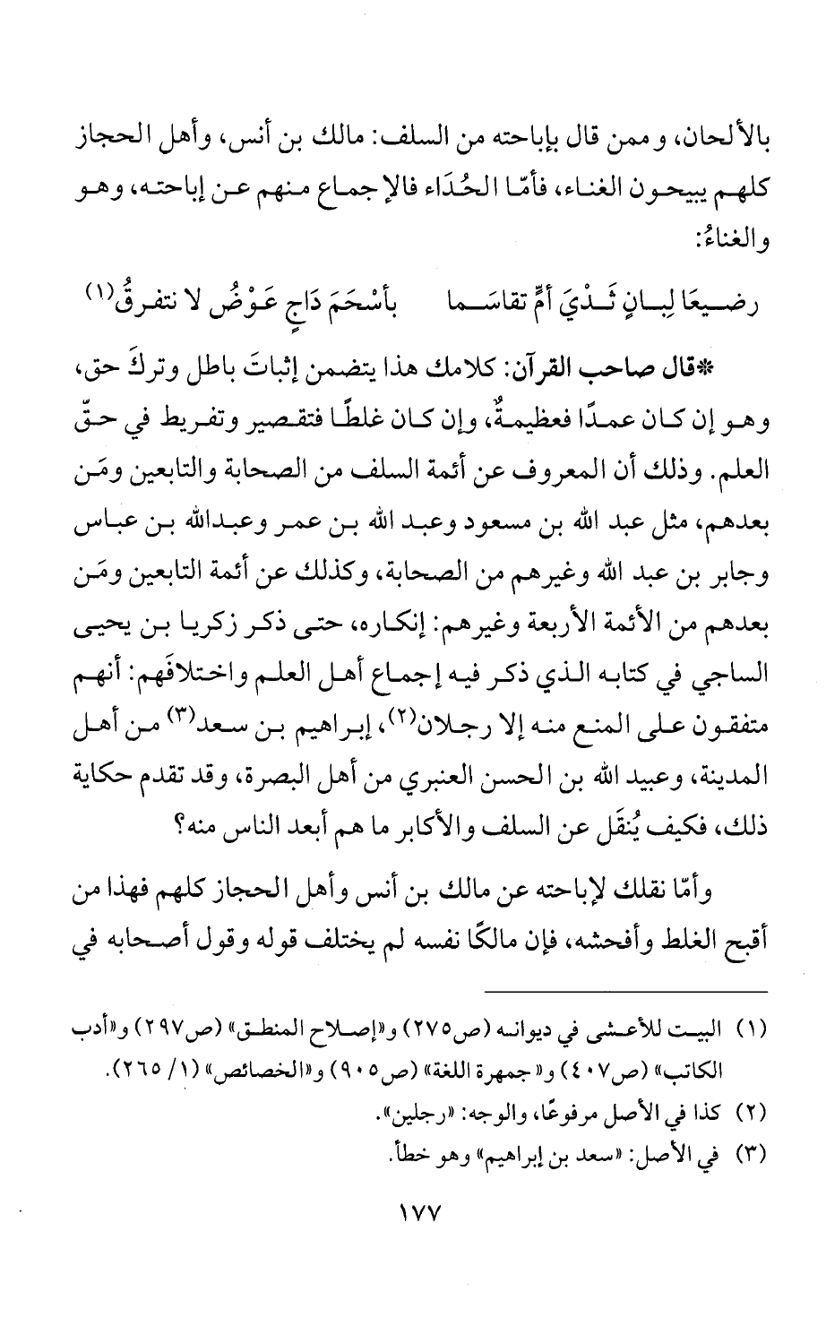 * قال صاحب القرآن: كلامك هذا يتضمن إثباتَ باطل وتركَ حق، وهو إن كان عمدًا فعظيمةٌ، وإن كان غلطًا فتقصير وتفريط في حقّ العلم. وذلك أن المعروف عن أئمة السلف من الصحابة والتابعين ومَن بعدهم، مثل عبد الله بن مسعود وعبد الله بن عمر وعبد الله بن عباس وجابر بن عبد الله وغيرهم من الصحابة، وكذلك عن أئمة التابعين ومَن بعدهم من الأئمة الأربعة وغيرهم: إنكاره، حتى ذكر زكريا بن يحيى الساجي في كتابه الذي ذكر فيه إجماع أهل العلم واختلافَهم: أنهم متفقون على المنع منه إلا رجلان (¬2)، إبراهيم بن سعد (¬3) من أهل المدينة، وعبيد الله بن الحسن العنبري من أهل البصرة، وقد تقدم حكاية ذلك، فكيف يُنقَل عن السلف والأكابر ما هم أبعد الناس منه؟