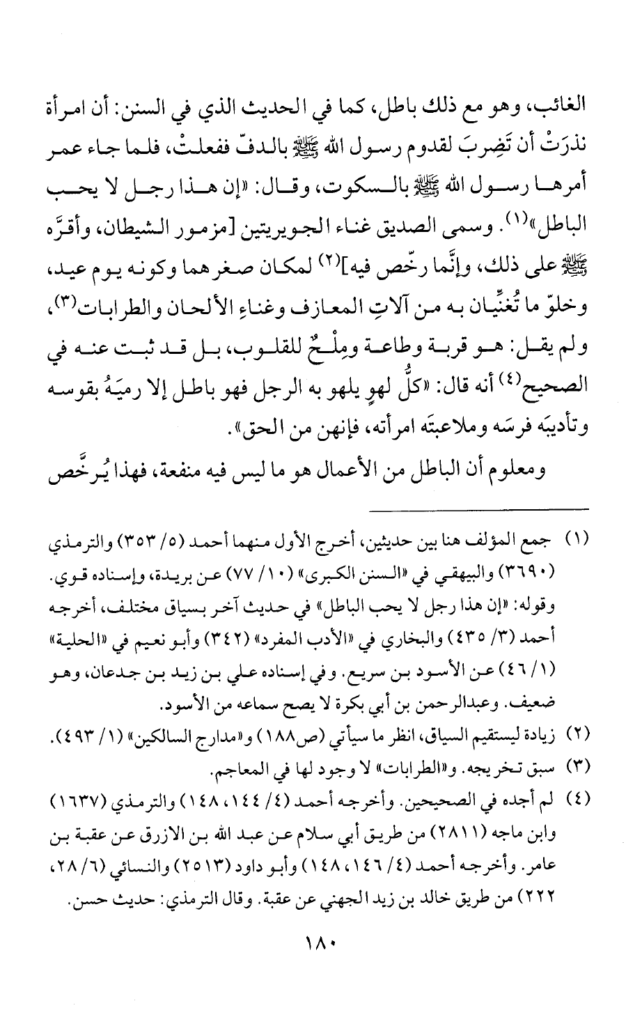 الغائب، وهو مع ذلك باطل، كما في الحديث الذي في السنن: أن امرأة نذرَتْ أن تَضِربَ لقدوم رسول الله - صلى الله عليه وسلم - بالدفّ ففعلتْ، فلما جاء عمر أمرها رسول الله - صلى الله عليه وسلم - بالسكوت، وقال: "إن هذا رجل لا يحب الباطل" (¬1). وسمى الصديق غناء الجويريتين [مزمور الشيطان، وأقرَّه - صلى الله عليه وسلم - على ذلك، وإنَّما رخص فيه] (¬2) لمكان صغرهما وكونه يوم عيد، وخلوّ ما تُغنِّيان به من آلاتِ المعازف وغناءِ الألحان والطرابات (¬3)، ولم يقل: هو قربة وطاعة ومِلْحٌ للقلوب، بل قد ثبت عنه في الصحيح (¬4) أنه قال: "كل لهوٍ يلهو به الرجل فهو باطل إلا رميَهُ بقوسه وتأديبَه فرسَه وملاعبتَه امرأته، فإنهن من الحق".