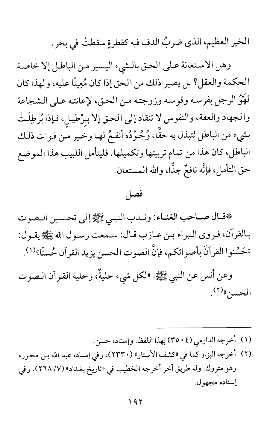 * قال صاحب الغناء: وندب النبي - صلى الله عليه وسلم - إلى تحسين الصوت بالقرآن، فروى البراء بن عازب قال: سمعت رسول الله - صلى الله عليه وسلم - يقول: "حَسِّنوا القرآنَ بأصواتكم، فإنَّ الصوت الحسن يزيد القرآن حُسنًا" (¬1).