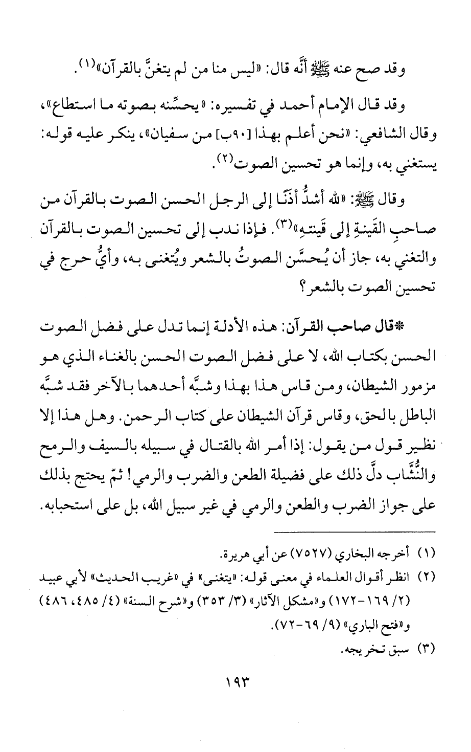 * قال صاحب القرآن: هذه الأدلة إنما تدل على فضل الصوت الحسن بكتاب الله، لا على فضل الصوت الحسن بالغناء الذي هو مزمور الشيطان، ومن قاس هذا بهذا وشبَّه أحدهما بالآخر فقد شبَّه الباطل بالحق، وقاس قرآن الشيطان على كتاب الرحمن. وهل هذا إلا نظير قول من يقول: إذا أمر الله بالقتال في سبيله بالسيف والرمح والنُّشَّاب دلَّ ذلك على فضيلة الطعن والضرب والرمي! ثمّ يحتج بذلك على جواز الضرب والطعن والرمي في غير سبيل الله، بل على استحبابه.