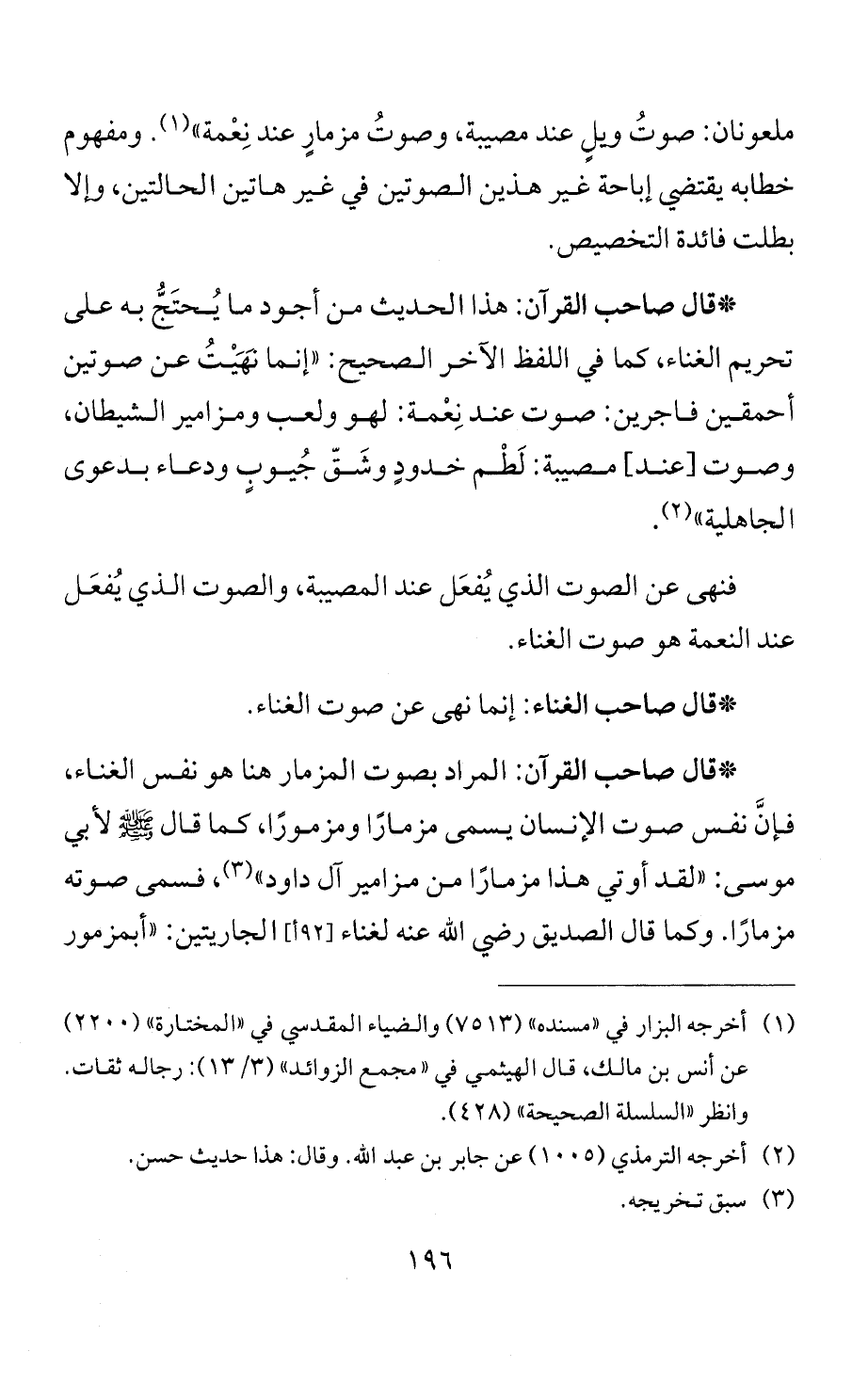 فنهى عن الصوت الذي يُفعَل عند المصيبة، والصوت الذي يُفعَل عند النعمة هو صوت الغناء.