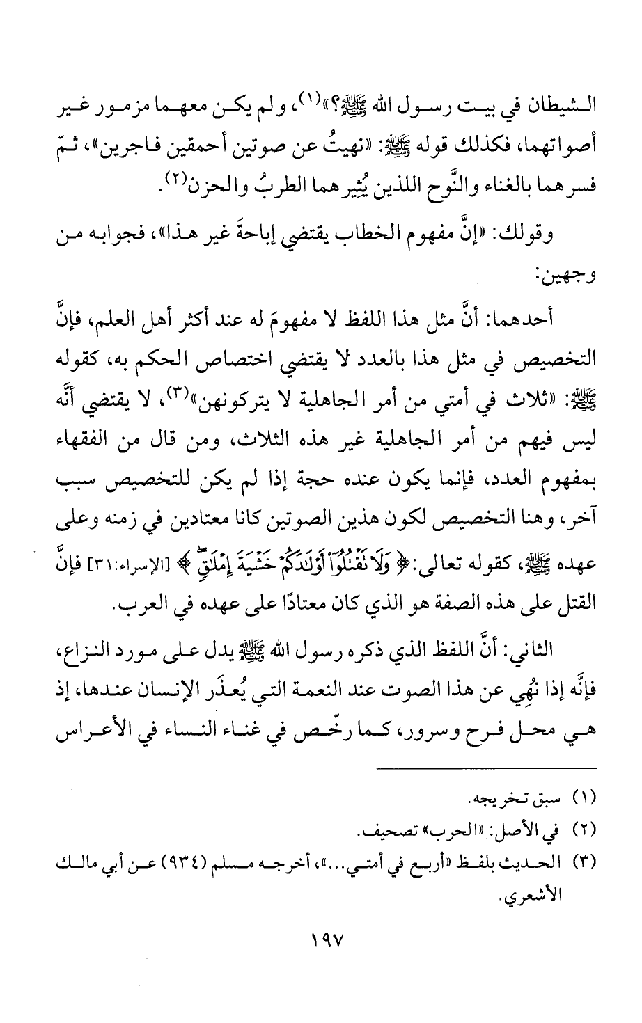 أحدهما: أنَّ مثل هذا اللفظ لا مفهومَ له عند أكثر أهل العلم، فإنَّ التخصيص في مثل هذا بالعدد لا يقتضي اختصاص الحكم به، كقوله - صلى الله عليه وسلم -: "ثلاث في أمتي من أمر الجاهلية لا يتركونهن" (¬3)، لا يقتضي أنَّه ليس فيهم من أمر الجاهلية غير هذه الثلاث، ومن قال من الفقهاء بمفهوم العدد، فإنما يكون عنده حجة إذا لم يكن للتخصيص سبب آخر، وهنا التخصيص لكون هذين الصوتين كانا معتادين في زمنه وعلى عهده - صلى الله عليه وسلم -، كقوله تعالى: {وَلَا تَقْتُلُوا أَوْلَادَكُمْ خَشْيَةَ إِمْلَاقٍ} [الإسراء: 31] فإنَّ القتل على هذه الصفة هو الذي كان معتادًا على عهده في العرب.