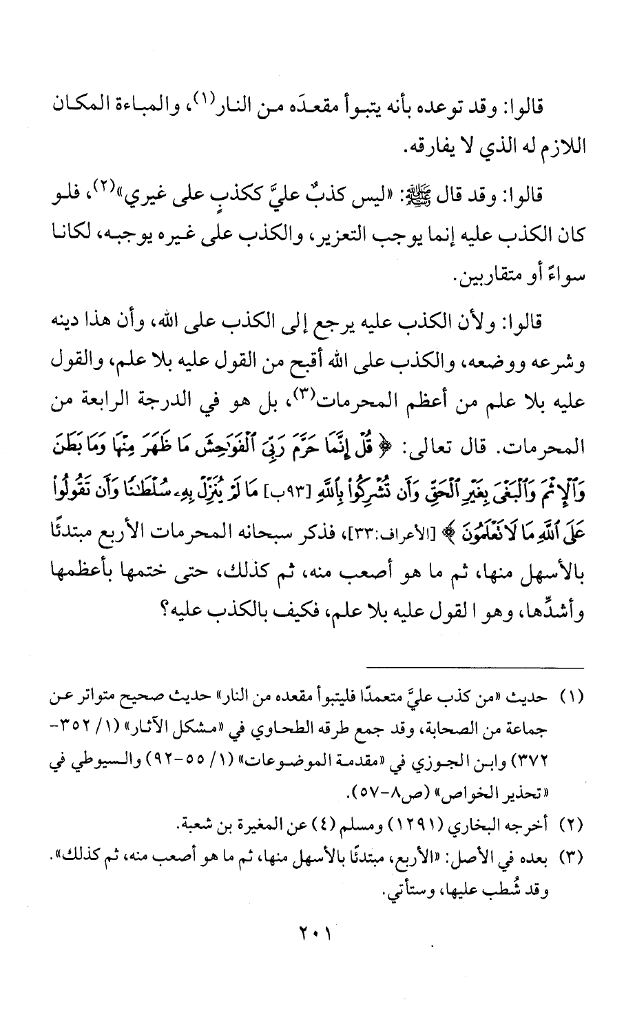قالوا: ولأن الكذب عليه يرجع إلى الكذب على الله، وأن هذا دينه وشرعه ووضعه، والكذب على الله أقبح من القول عليه بلا علم، والقول عليه بلا علم من أعظم المحرمات (¬3)، بل هو في الدرجة الرابعة من المحرمات. قال تعالى: {قُلْ إِنَّمَا حَرَّمَ رَبِّيَ الْفَوَاحِشَ مَا ظَهَرَ مِنْهَا وَمَا بَطَنَ وَالْإِثْمَ وَالْبَغْيَ بِغَيْرِ الْحَقِّ وَأَنْ تُشْرِكُوا بِاللَّهِ مَا لَمْ يُنَزِّلْ بِهِ سُلْطَانًا وَأَنْ تَقُولُوا عَلَى اللَّهِ مَا لَا تَعْلَمُونَ} [الأعراف: 33]، فذكر سبحانه المحرمات الأربع مبتدئًا بالأسهل منها، ثم ما هو أصعب منه، ثم كذلك، حتى ختمها بأعظمها وأشدِّها، وهو القول عليه بلا علم، فكيف بالكذب عليه؟
