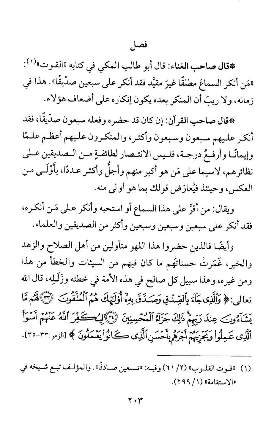 * قال صاحب الغناء: قال أبو طالب المكي في كتابه "القوت" (¬1): "مَن أنكر السماعَ مطلقًا غيرَ مقيَّد فقد أنكر على سبعين صدّيقًا". هذا في زمانه، ولا ريبَ أن المنكر بعده يكون إنكاره على أضعاف هؤلاء.