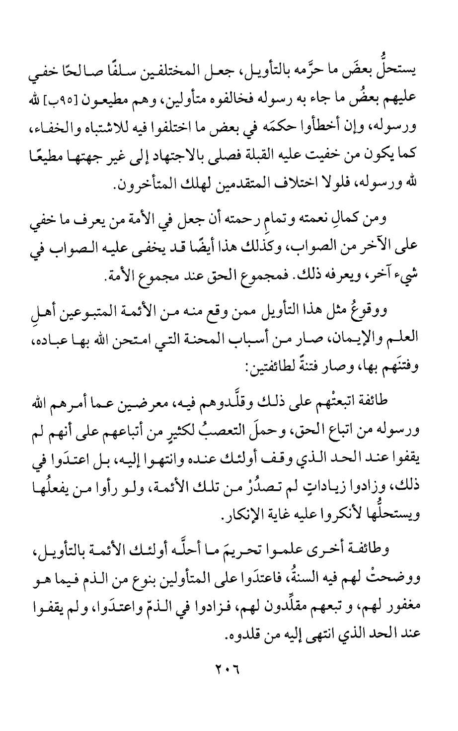 يستحلُّ بعضَ ما حرَّمه بالتأويل، جعل المختلفين سلفًا صالحًا خفي عليهم بعضُ ما جاء به رسوله فخالفوه متأولين، وهم مطيعون لله ورسوله، وإن أخطأوا حكمَه في بعض ما اختلفوا فيه للاشتباه والخفاء، كما يكون من خفيت عليه القبلة فصلى بالاجتهاد إلى غير جهتها مطيعًا لله ورسوله، فلولا اختلاف المتقدمين لهلك المتأخرون.