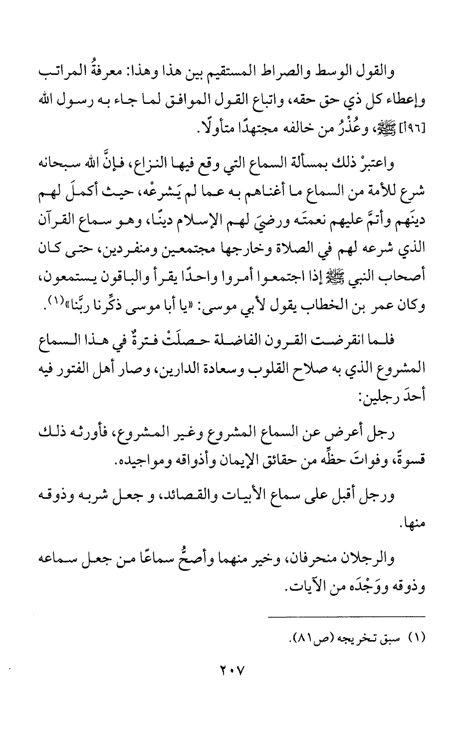 واعتبرْ ذلك بمسألة السماع التي وقع فيها النزاع، فإنَّ الله سبحانه شرع للأمة من السماع ما أغناهم به عما لم يَشرعْه، حيث أكملَ لهم دينَهم وأتمَّ عليهم نعمتَه ورضيَ لهم الإسلام دينًا، وهو سماع القرآن الذي شرعه لهم في الصلاة وخارجها مجتمعين ومنفردين، حتى كان أصحاب النبي - صلى الله عليه وسلم - إذا اجتمعوا أمروا واحدًا يقرأ والباقون يستمعون، وكان عمر بن الخطاب يقول لأبي موسى: "يا أبا موسى ذكِّرنا ربَّنا" (¬1).