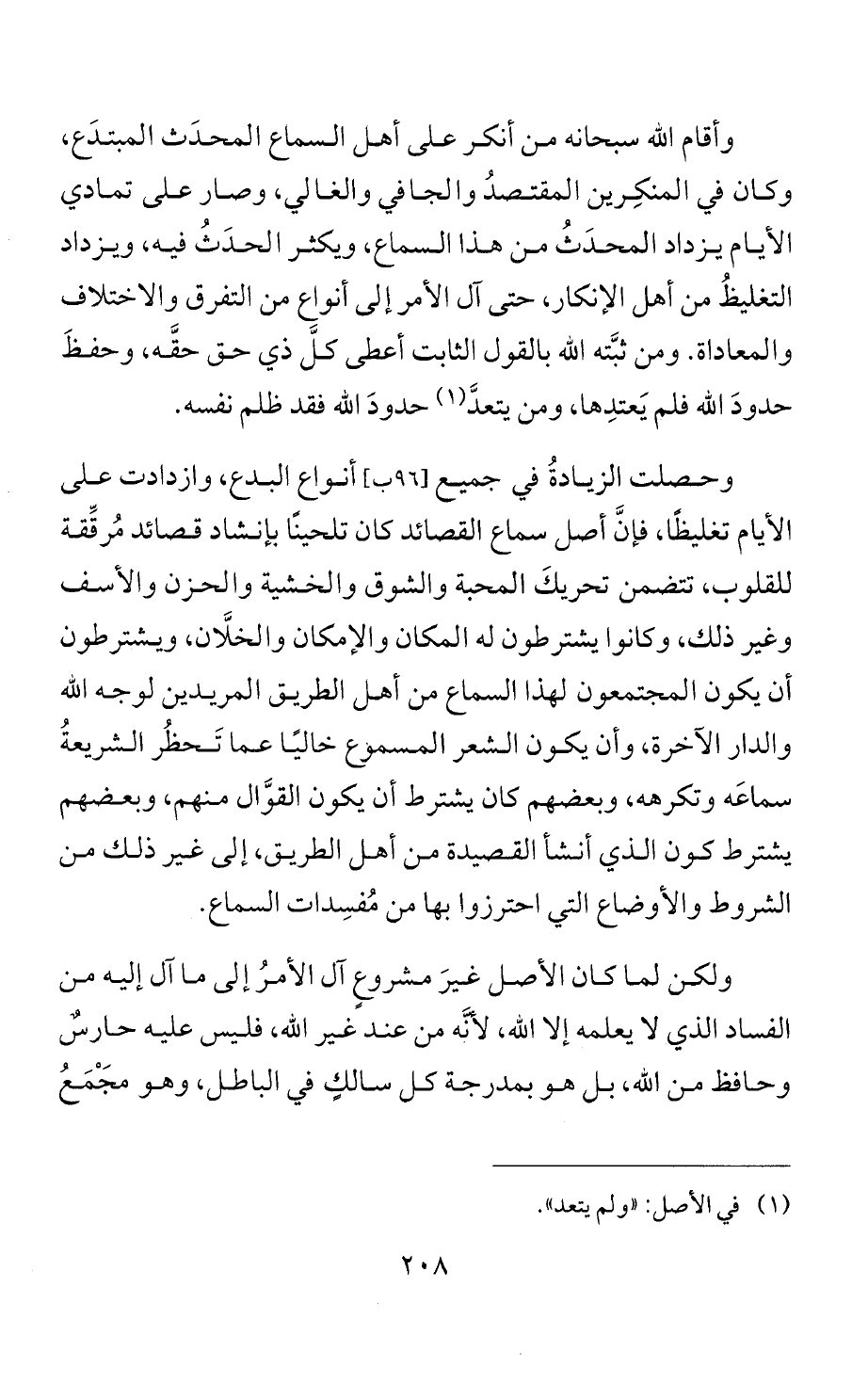 وأقام الله سبحانه من أنكر على أهل السماع المحدَث المبتدَع، وكان في المنكِرين المقتصدُ والجافي والغالي، وصار على تمادي الأيام يزداد المحدَثُ من هذا السماع، ويكثر الحدَثُ فيه، ويزداد التغليظُ من أهل الإنكار، حتى آل الأمر إلى أنواع من التفرق والاختلاف والمعاداة. ومن ثبَّته الله بالقول الثابت أعطى كلَّ ذي حق حقَّه، وحفظَ حدودَ الله فلم يَعتدِها، ومن يتعدَّ (¬1) حدودَ الله فقد ظلم نفسه.