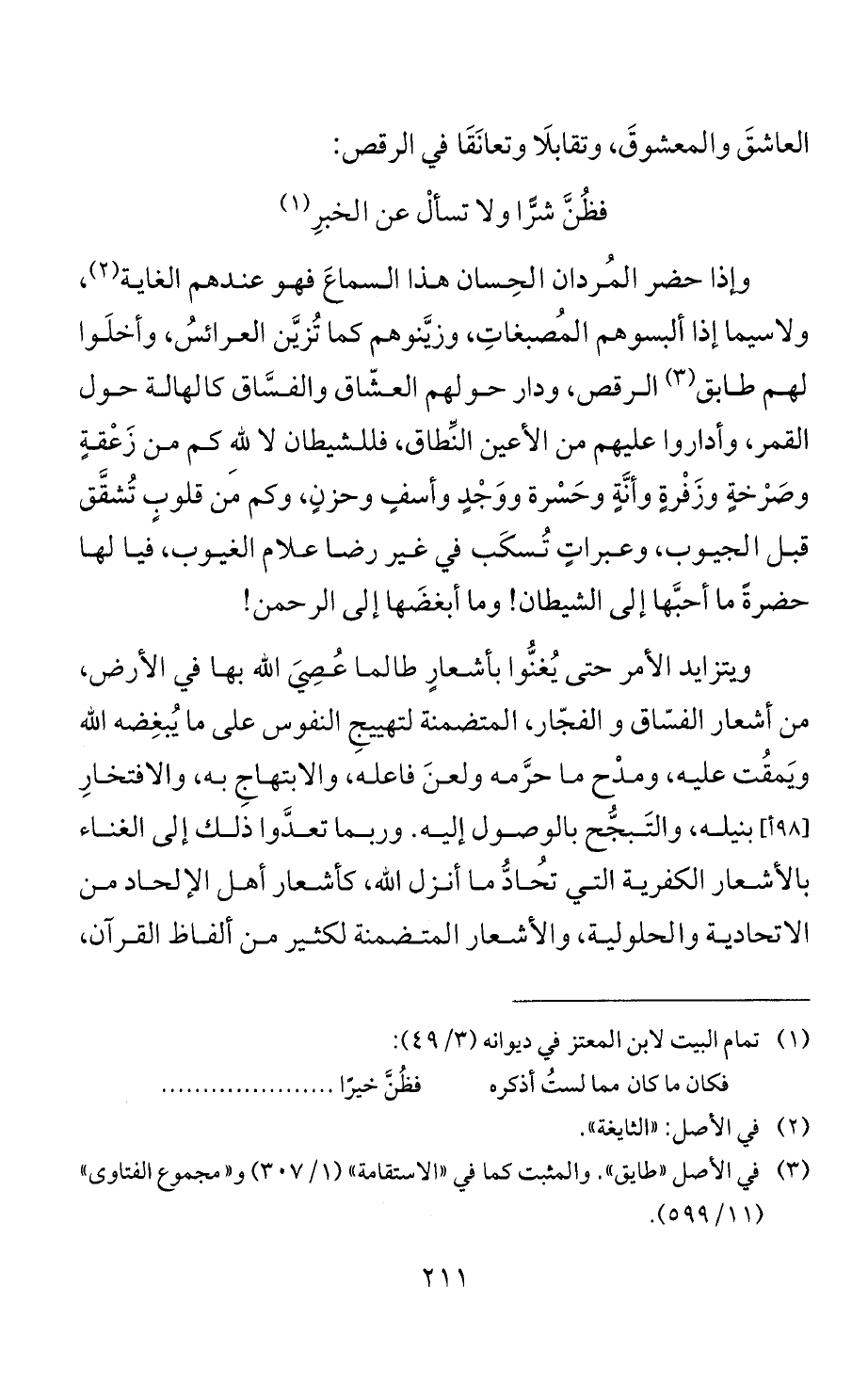 ويتزايد الأمر حتى يُغنُّوا بأشعارٍ طالما عُصِيَ الله بها في الأرض، من أشعار الفسّاق والفجّار، المتضمنة لتهييجِ النفوس على ما يُبغِضه الله ويَمقُت عليه، ومدْح ما حرَّمه ولعنَ فاعله، والابتهاجِ به، والافتخارِ بنيله، والتَبجُّح بالوصول إليه. وربما تعدَّوا ذلك إلى الغناء بالأشعار الكفرية التي تُحادُّ ما أنزل الله، كأشعار أهل الإلحاد من الاتحادية والحلولية، والأشعار المتضمنة لكثير من ألفاظ القرآن،