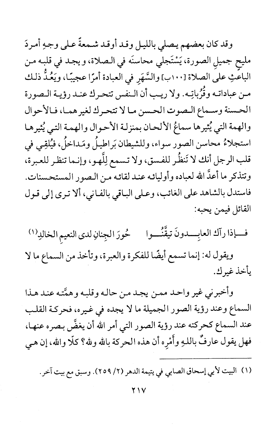 وقد كان بعضهم يصلي بالليل وقد أوقد شمعةً على وجهِ أمردَ مليحٍ جميلِ الصورة، يَسْتَجلي محاسنَه في الصلاة، ويجد في قلبه من الباعثِ على الصلاة والسَّهَرِ في العبادة أمرًا عجيبًا، ويَعُدُّ ذلك من عباداته وقُرُباتِه. ولا ريب أن النفس تتحرك عند رؤية الصورة الحسنة وسماع الصوت الحسن ما لا تتحرك لغيرهما، فالأحوال والهمة التي يُثيرها سماعُ الألحان بمنزلة الأحوال والهمة التي يُثيرها استجلاءُ محاسن الصور سواء، وللشيطان بَراطيلُ ومَداخلُ، فيُلقِي في قلب الرجل أنك لا تَنظُر للفسق، ولا تسمع لِلَّهو، وإنما تنظر للعبرة، وتتذكر ما أعدَّ الله لعباده وأوليائه عند لقائه من الصور المستحسنات. فاستدل بالشاهد على الغائب، وعلى الباقي بالفاني، ألا ترى إلى قول القائل فيمن يحبه: