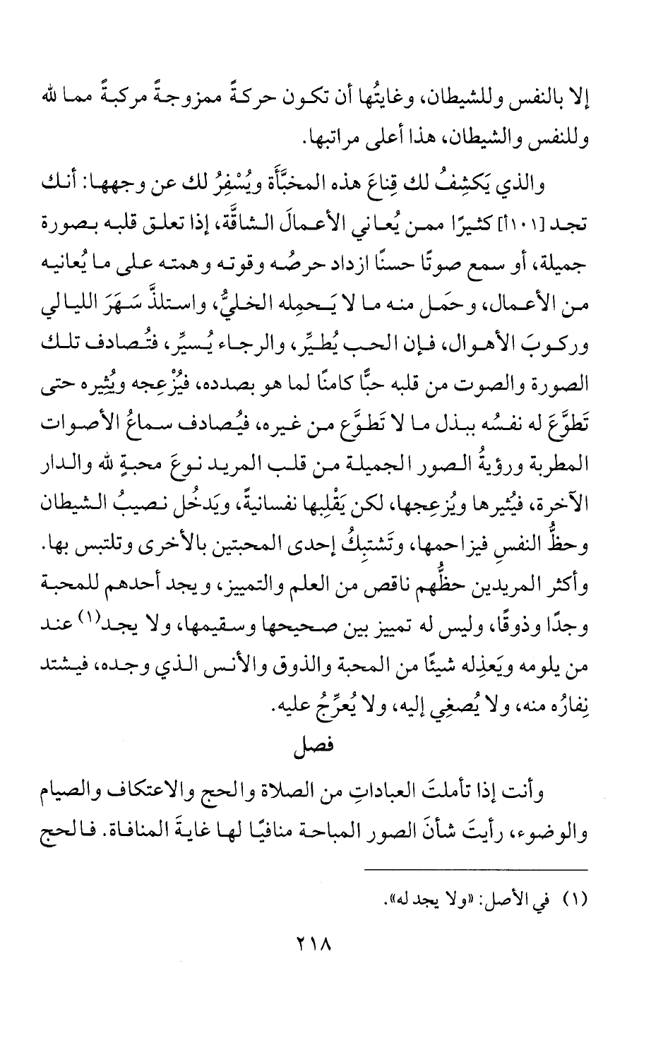 والذي يَكشِفُ لك قِناعَ هذه المخبَّأَة ويُسْفِرُ لك عن وجهها: أنك تجد كثيرًا ممن يُعاني الأعمالَ الشاقَّة، إذا تعلق قلبه بصورة جميلة، أو سمع صوتًا حسنًا ازداد حرصُه وقوته وهمته على ما يُعانيه من الأعمال، وحَمل منه ما لا يَحمِله الخليُّ، واستلذَّ سهَرَ الليالي وركوبَ الأهوال، فإن الحب يُطيِّر، والرجاء يُسيِّر، فتُصادف تلك الصورة والصوت من قلبه حبًّا كامنًا لما هو بصدده، فيُزْعِجه ويُثيره حتى تَطوَّعَ له نفسُه ببذل ما لا تَطوَّع من غيره، فيُصادف سماعُ الأصوات المطربة ورؤيةُ الصور الجميلة من قلب المريد نوعَ محبةٍ لله والدار الآخرة، فيُثيرها ويُزعِجها، لكن يَقْلِبها نفسانيةً، ويَدخُل نصيبُ الشيطان وحظُّ النفس فيزاحمها، وتَشتبِكُ إحدى المحبتين بالأخرى وتلتبس بها. وأكثر المريدين حظُّهم ناقص من العلم والتمييز، ويجد أحدهم للمحبة وجدًا وذوقًا، وليس له تمييز بين صحيحها وسقيمها، ولا يجد (¬1) عند من يلومه ويَعذِله شيئًا من المحبة والذوق والأنس الذي وجده، فيشتد نِفارُه منه، ولا يُصغِي إليه، ولا يُعرِّجُ عليه.