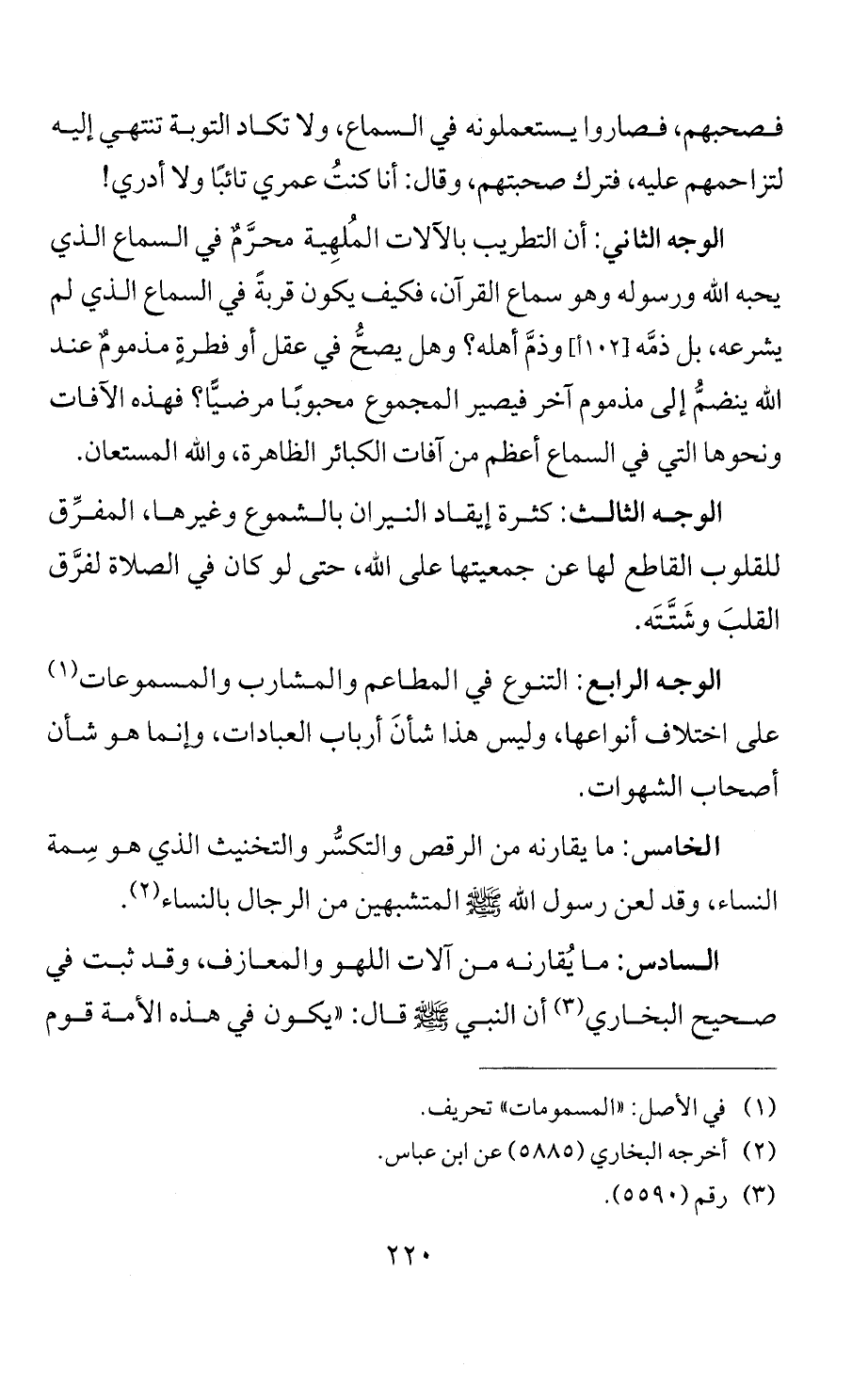 السادس: ما يُقارنه من آلات اللهو والمعازف، وقد ثبت في صحيح البخاري (¬3) أن النبي - صلى الله عليه وسلم - قال: "يكون في هذه الأمة قوم