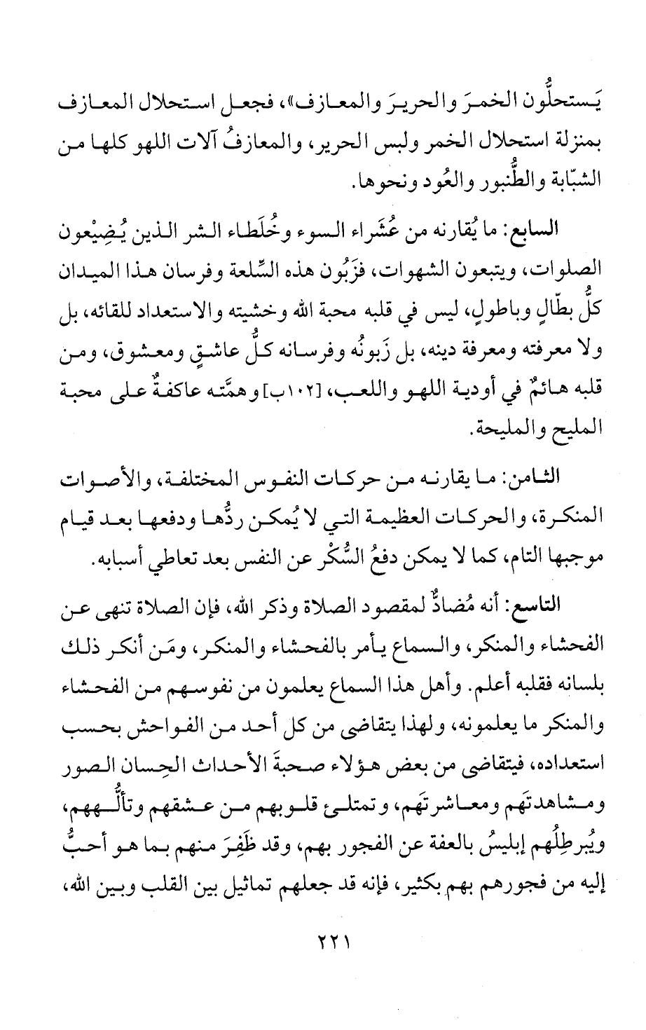 التاسع: أنه مُضادٌّ لمقصود الصلاة وذكر الله، فإن الصلاة تنهى عن الفحشاء والمنكر، والسماع يأمر بالفحشاء والمنكر، ومَن أنكر ذلك بلسانه فقلبه أعلم. وأهل هذا السماع يعلمون من نفوسهم من الفحشاء والمنكر ما يعلمونه، ولهذا يتقاضى من كل أحد من الفواحش بحسب استعداده، فيتقاضى من بعض هؤلاء صحبةَ الأحداث الحِسان الصور ومشاهدتهَم ومعاشرتهَم، وتمتلئ قلوبهم من عشقهم وتألُّههم، ويُبرطِلُهم إبليسُ بالعفة عن الفجور بهم، وقد ظَفِرَ منهم بما هو أحبُّ إليه من فجورهم بهم بكثير، فإنه قد جعلهم تماثيل بين القلب وبين الله،