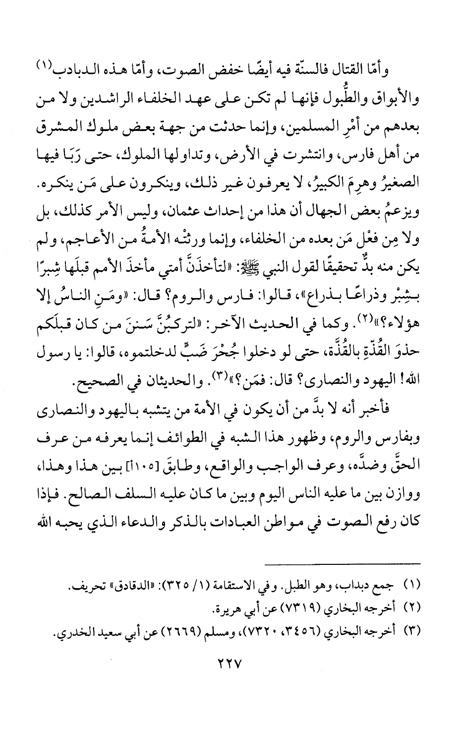 فأخبر أنه لابدَّ من أن يكون في الأمة من يتشبه باليهود والنصارى وبفارس والروم، وظهور هذا الشبه في الطوائف إنما يعرفه من عرف الحقَّ وضدَّه، وعرف الواجب والواقع، وطابقَ بين هذا وهذا، ووازن بين ما عليه الناس اليوم وبين ما كان عليه السلف الصالح. فإذا كان رفع الصوت في مواطن العبادات بالذكر والدعاء الذي يحبه الله