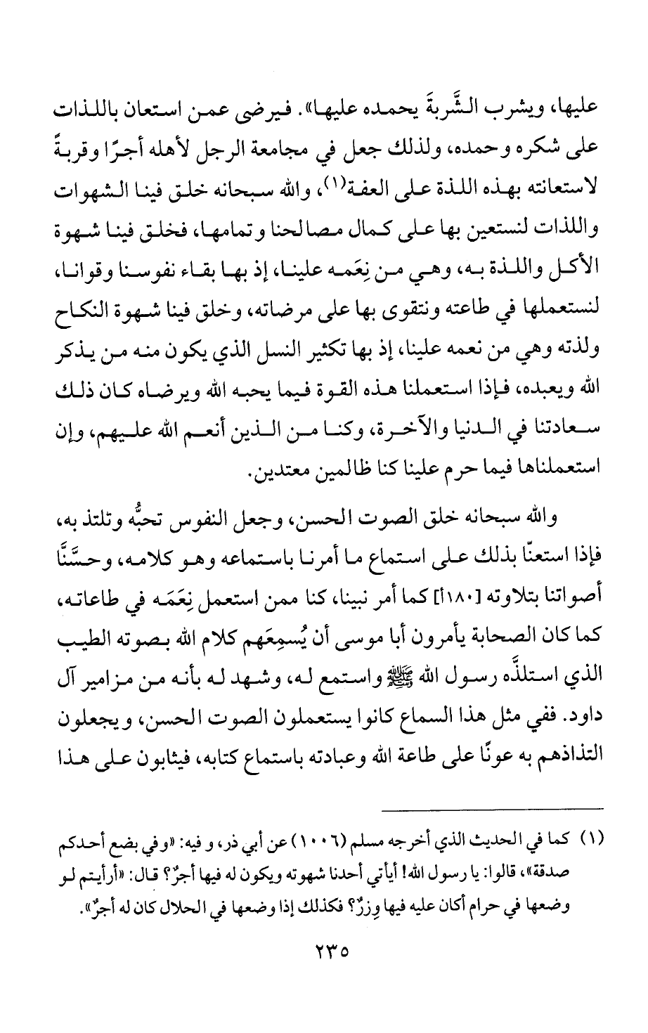 والله سبحانه خلق الصوت الحسن، وجعل النفوس تحبُّه وتلتذ به، فإذا استعنّا بذلك على استماع ما أمرنا باستماعه وهو كلامه، وحسَّنَّا أصواتنا بتلاوته كما أمر نبينا، كنا ممن استعمل نِعَمَه في طاعاته، كما كان الصحابة يأمرون أبا موسى أن يُسمِعَهم كلام الله بصوته الطيب الذي استلذَّه رسول الله - صلى الله عليه وسلم - واستمع له، وشهد له بأنه من مزامير آل داود. ففي مثل هذا السماع كانوا يستعملون الصوت الحسن، ويجعلون التذاذهم به عونًا على طاعة الله وعبادته باستماع كتابه، فيثابون على هذا