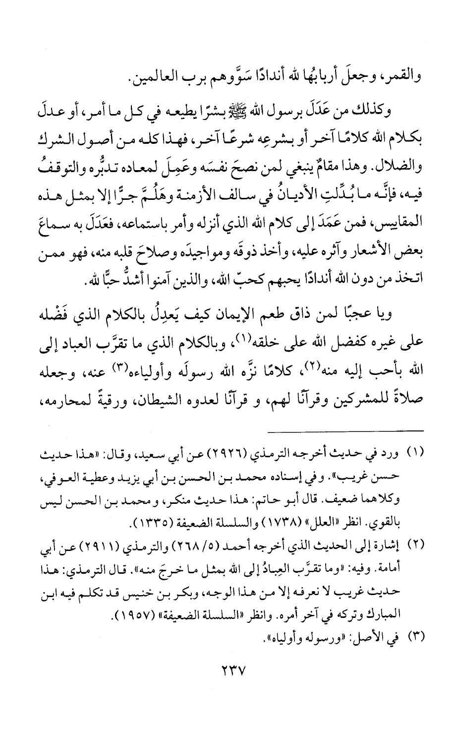 وكذلك من عَدَلَ برسول الله - صلى الله عليه وسلم - بشرًا يطيعه في كل ما أمر، أو عدلَ بكلام الله كلامًا آخر أو بشرعِه شرعًا آخر، فهذا كله من أصول الشرك والضلال. وهذا مقامٌ ينبغي لمن نصحَ نفسَه وعَمِلَ لمعاده تدبُّره والتوقفُ فيه، فإنَّه ما بُدِّلتِ الأديانُ في سالف الأزمنة وهَلُمَّ جرًّا إلا بمثل هذه المقاييس، فمن عَمَدَ إلى كلام الله الذي أنزله وأمر باستماعه، فعَدَلَ به سماعَ بعض الأشعار وآثره عليه، وأخذ ذوقَه ومواجيدَه وصلاحَ قلبه منه، فهو ممن اتخذ من دون الله أندادًا يحبهم كحبّ الله، والذين آمنوا أشدُّ حبًّا لله.