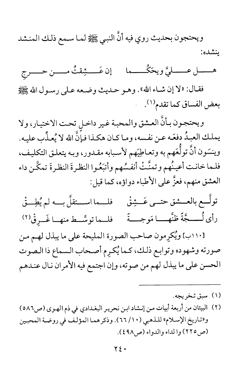 ويحتجون بأنَّ العشق والمحبة غير داخلٍ تحت الاختيار، ولا يملك العبدُ دفعَه عن نفسه، وما كان هكذا فإنَّ الله لا يُعذِّب عليه. وينسَون أنَّ تولُّعَهم به وتعاطِيَهم لأسبابه مقدور، وبه يتعلق التكليف، فلما خانت أعينُهم وتمنَّتْ أنفسُهم وأتبَعُوا النظرةَ النظرةَ تمكَّن داء العشق منهم، فعزَّ على الأطباء دواؤه، كما قيل: