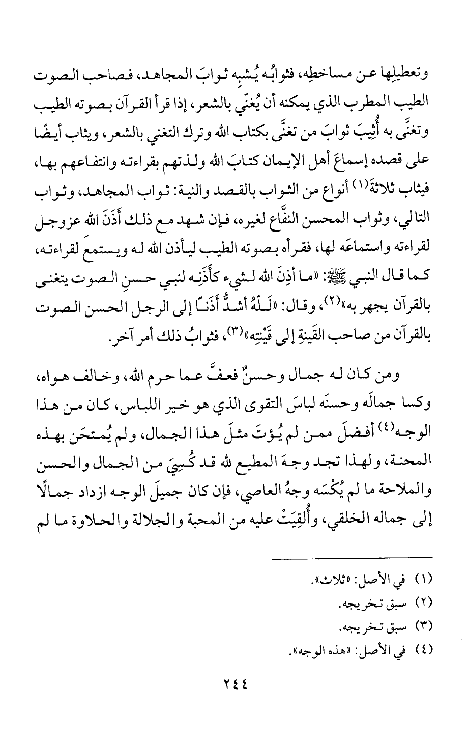 وتعطيلِها عن مساخطِه، فثوابُه يُشبِه ثوابَ المجاهد، فصاحب الصوت الطيب المطرب الذي يمكنه أن يُغنّي بالشعر، إذا قرأ القرآن بصوته الطيب وتغنَّى به أُثِيبَ ثوابَ من تغنَّى بكتاب الله وترك التغني بالشعر، ويثاب أيضًا على قصده إسماعَ أهل الإيمان كتابَ الله ولذتهم بقراءته وانتفاعهم بها، فيثاب ثلاثةَ (¬1) أنواع من الثواب بالقصد والنية: ثواب المجاهد، وثواب التالي، وثواب المحسن النفَّاع لغيره، فإن شهد مع ذلك أَذَنَ اللهِ -عز وجل- لقراءته واستماعَه لها، فقرأه بصوته الطيب ليأذن الله له ويستمع لقراءته، كما قال النبي - صلى الله عليه وسلم -: "ما أذِنَ الله لشيء كأَذَنِه لنبي حسنِ الصوت يتغنى بالقرآن يجهر به" (¬2)، وقال: "لَلّهُ أشدُّ أَذَنًا إلى الرجل الحسن الصوت بالقرآن من صاحب القَينةِ إلى قَيْنتِه" (¬3)، فثوابُ ذلك أمر آخر.