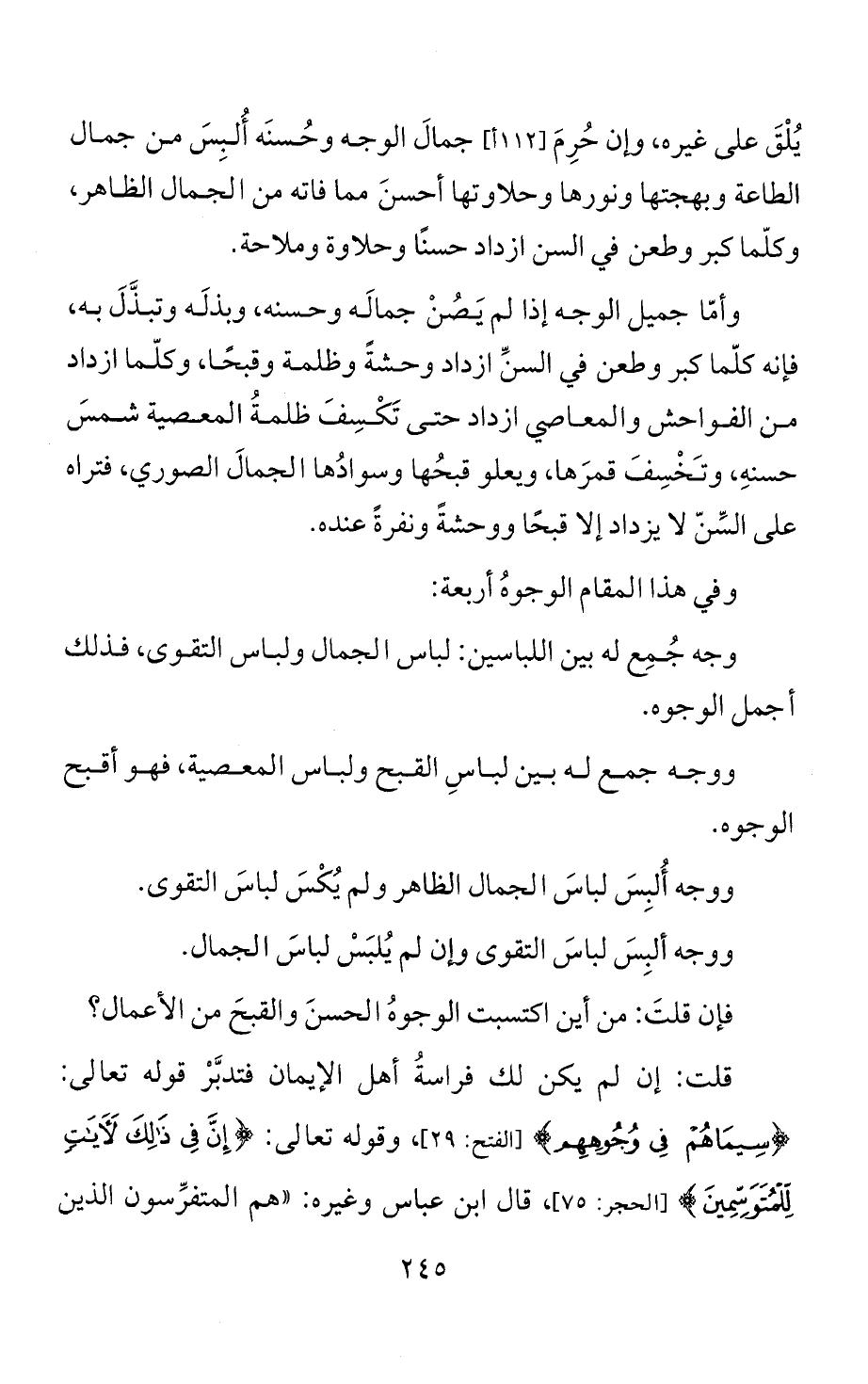 وأمّا جميل الوجه إذا لم يَصُنْ جمالَه وحسنه، وبذلَه وتبذَّلَ به، فإنه كلّما كبر وطعن في السنِّ ازداد وحشةً وظلمة وقبحًا، وكلّما ازداد من الفواحش والمعاصي ازداد حتى تَكْسِفَ ظلمةُ المعصية شمسَ حسنهِ، وتَخْسِفَ قمرَها، ويعلو قبحُها وسوادُها الجمالَ الصوري، فتراه على السِّنّ لا يزداد إلا قبحًا ووحشةً ونفرةً عنده.
