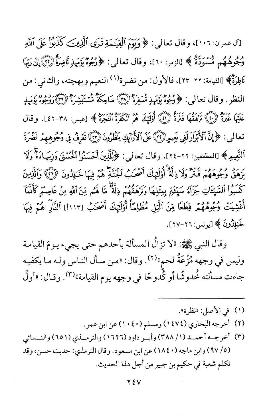 [آل عمران: 106]، وقال تعالى: {وَيَوْمَ الْقِيَامَةِ تَرَى الَّذِينَ كَذَبُوا عَلَى اللَّهِ وُجُوهُهُمْ مُسْوَدَّةٌ} [الزمر: 60]، وقال تعالى: {وُجُوهٌ يَوْمَئِذٍ نَاضِرَةٌ (22) إِلَى رَبِّهَا نَاظِرَةٌ} [القيامة: 22 - 23]، فالأول: من نضرة (¬1) النعيم وبهجته، والثاني: من النظر. وقال تعالى: {وُجُوهٌ يَوْمَئِذٍ مُسْفِرَةٌ (38) ضَاحِكَةٌ مُسْتَبْشِرَةٌ (39) وَوُجُوهٌ يَوْمَئِذٍ عَلَيْهَا غَبَرَةٌ (40) تَرْهَقُهَا قَتَرَةٌ (41) أُولَئِكَ هُمُ الْكَفَرَةُ الْفَجَرَةُ} [عبس: 38 - 42]. وقال تعالى: {إِنَّ الْأَبْرَارَ لَفِي نَعِيمٍ (22) عَلَى الْأَرَائِكِ يَنْظُرُونَ (23) تَعْرِفُ فِي وُجُوهِهِمْ نَضْرَةَ النَّعِيمِ (24)} [المطففين: 22 - 24]. وقال تعالى: {لِلَّذِينَ أَحْسَنُوا الْحُسْنَى وَزِيَادَةٌ وَلَا يَرْهَقُ وُجُوهَهُمْ قَتَرٌ وَلَا ذِلَّةٌ أُولَئِكَ أَصْحَابُ الْجَنَّةِ هُمْ فِيهَا خَالِدُونَ (26) وَالَّذِينَ كَسَبُوا السَّيِّئَاتِ جَزَاءُ سَيِّئَةٍ بِمِثْلِهَا وَتَرْهَقُهُمْ ذِلَّةٌ مَا لَهُمْ مِنَ اللَّهِ مِنْ عَاصِمٍ كَأَنَّمَا أُغْشِيَتْ وُجُوهُهُمْ قِطَعًا مِنَ اللَّيْلِ مُظْلِمًا أُولَئِكَ أَصْحَابُ النَّارِ هُمْ فِيهَا خَالِدُونَ} [يونس: 26 - 27].