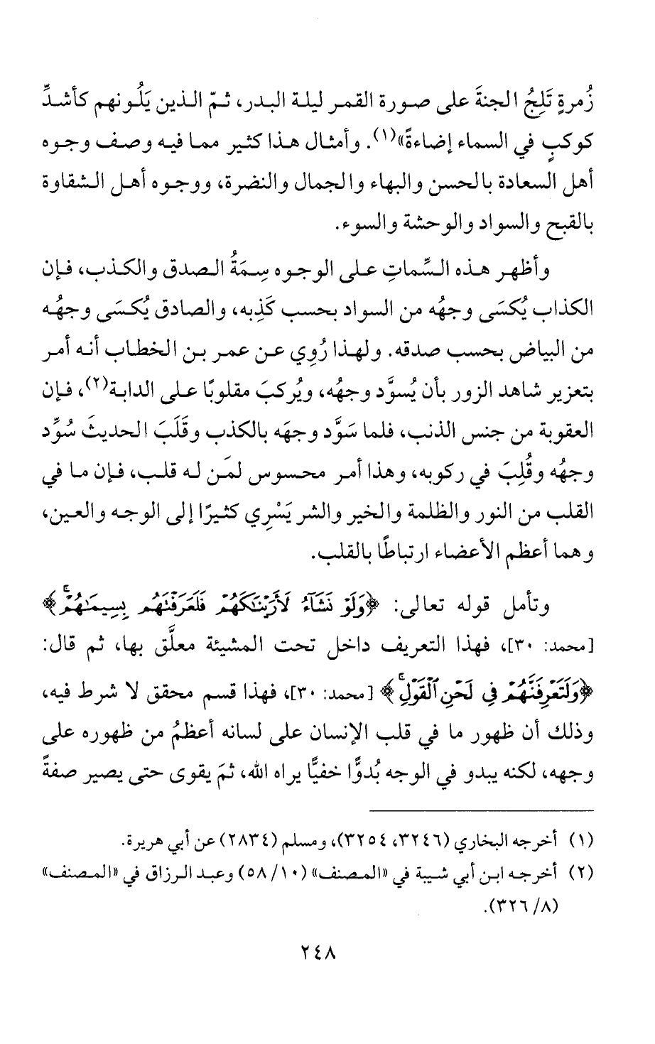 وتأمل قوله تعالى: {وَلَوْ نَشَاءُ لَأَرَيْنَاكَهُمْ فَلَعَرَفْتَهُمْ بِسِيمَاهُمْ} [محمد: 30]، فهذا التعريف داخل تحت المشيئة معلَّق بها، ثم قال: {وَلَتَعْرِفَنَّهُمْ فِي لَحْنِ الْقَوْلِ} [محمد: 30]، فهذا قسم محقق لا شرط فيه، وذلك أن ظهور ما في قلب الإنسان على لسانه أعظمُ من ظهوره على وجهه، لكنه يبدو في الوجه بُدوًّا خفيّا يراه الله، ثمَ يقوى حتى يصير صفةً