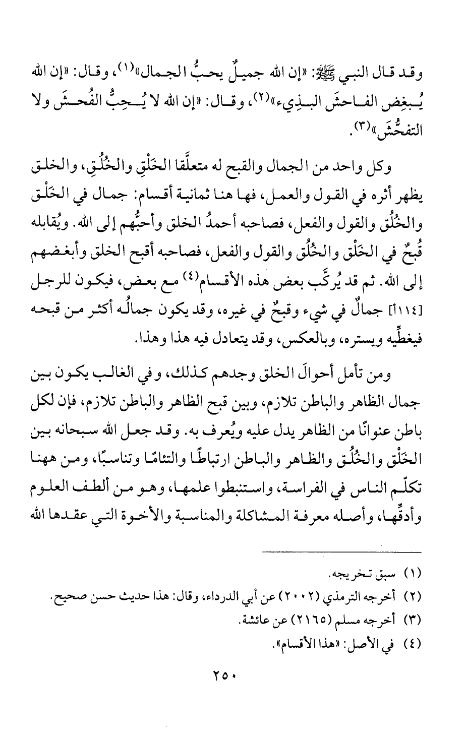 وكل واحد من الجمال والقبح له متعلَّقا الخَلْقِ والخُلُقِ، والخلق يظهر أثره في القول والعمل، فهاهنا ثمانية أقسام: جمال في الخَلْق والخُلُق والقول والفعل، فصاحبه أحمدُ الخلق وأحبُّهم إلى الله. ويُقابله قُبحٌ في الخَلْق والخُلُق والقول والفعل، فصاحبه أقبح الخلق وأبغضهم إلى الله. ثم قد يُركَّب بعض هذه الأقسام (¬4) مع بعض، فيكون للرجل جمالٌ في شيء وقبحٌ في غيره، وقد يكون جمالُه أكثر من قبحه فيغطِّيه ويستره، وبالعكس، وقد يتعادل فيه هذا وهذا.