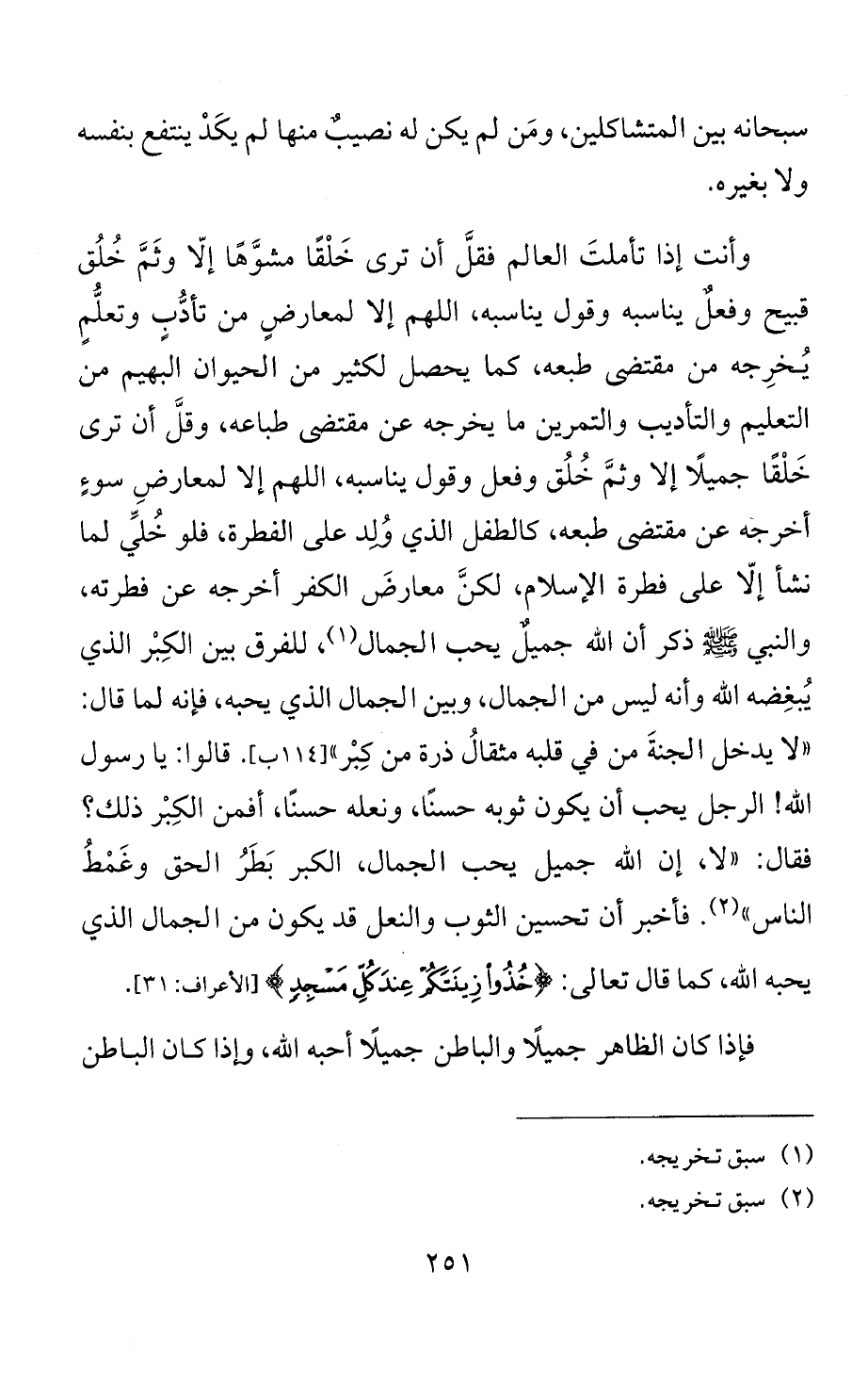 وأنت إذا تأملتَ العالم فقلَّ أن ترى خَلْقًا مشوَّهًا إلّا وثَمَّ خُلُق قبيح وفعلٌ يناسبه وقول يناسبه، اللهم إلا لمعارضٍ من تأدُّبٍ وتعلُّمٍ يُخرِجه من مقتضى طبعه، كما يحصل لكثير من الحيوان البهيم من التعليم والتأديب والتمرين ما يخرجه عن مقتضى طباعه، وقلَّ أن ترى خَلْقًا جميلًا إلا وثمَّ خُلُق وفعل وقول يناسبه، اللهم إلا لمعارضِ سوءٍ أخرجه عن مقتضى طبعه، كالطفل الذي وُلد على الفطرة، فلو خُليِّ لما نشأ إلّا على فطرة الإسلام، لكنَّ معارضَ الكفر أخرجه عن فطرته، والنبي - صلى الله عليه وسلم - ذكر أن الله جميلٌ يحب الجمال (¬1)، للفرق بين الكِبْر الذي يُبغِضه الله وأنه ليس من الجمال، وبين الجمال الذي يحبه، فإنه لما قال: "لا يدخل الجنةَ من في قلبه مثقالُ ذرة من كِبْر". قالوا: يا رسول الله! الرجل يحب أن يكون ثوبه حسنًا، ونعله حسنًا، أفمن الكِبْر ذلك؟ فقال: "لا، إن الله جميل يحب الجمال، الكبر بَطَرُ الحق وغَمْطُ الناس" (¬2). فأخبر أن تحسين الثوب والنعل قد يكون من الجمال الذي يحبه الله، كما قال تعالى: {خُذُوا زِينَتَكُمْ عِنْدَ كُلِّ مَسْجِدٍ} [الأعراف: 31].