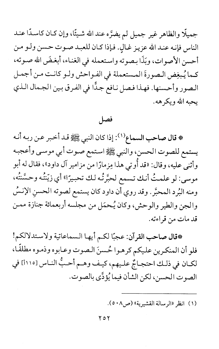 *قال صاحب القرآن: عجبًا لكم أيها السماعاتية ولاستدلالكم! فلو أن المنكرين عليكم كرهوا حُسنَ الصوت وعابوه وذموه مطلقًا، لكان في ذلك احتجاجٌ عليهم، كيف وهم أحبُّ الناس في الصوت الحسن، لكن الشأن فيما يُؤدَّى بالصوت.