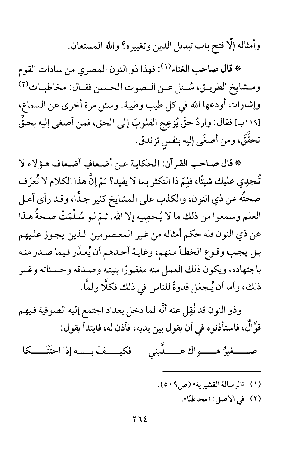 * قال صاحب القرآن: الحكاية عن أضعافِ أضعاف هؤلاء لا تُجدِي عليك شيئًا، فلِمَ ذا التكثر بما لا يفيد؟ ثمّ إنَّ هذا الكلام لا تُعرَف صحتُه عن ذي النون، والكذب على المشايخ كثير جدًّا، وقد رأى أهل العلم وسمعوا من ذلك ما لا يُحصِيه إلا الله. ثمّ لو سُلِّمَتْ صحةُ هذا عن ذي النون فله حكم أمثاله من غير المعصومين الذين يجوز عليهم بل يجب وقوع الخطأ منهم، وغاية أحدهم أن يُعذَر فيما صدر منه باجتهاده، ويكون ذلك العمل منه مغفورًا بنيته وصدقه وحسناته وغير ذلك، وأما أن يُجعَل قدوةً للناس في ذلك فكلَّا ولمَّا.