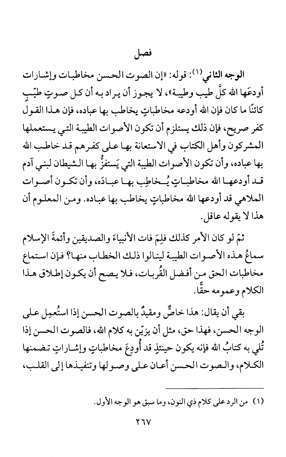 الوجه الثاني (¬1): قوله: "إن الصوت الحسن مخاطبات وإشارات أودعَها الله كلَّ طيب وطيبة"، لا يجوز أن يراد به أن كل صوتٍ طيّبٍ كائنًا ما كان فإن الله أودعه مخاطباتٍ يخاطب بها عباده، فإن هذا القول كفر صريح، فإن ذلك يستلزم أن تكون الأصوات الطيبة التي يستعملها المشركون وأهل الكتاب في الاستعانة بها على كفرهم قد خاطب الله بها عباده، وأن تكون الأصوات الطيبة التي يَستفزُّ بها الشيطان لبني آدم قد أودعها الله مخاطباتٍ يُخاطِب بها عبادَه، وأن تكون أصوات الملاهي قد أودعها الله مخاطباتٍ يخاطب بها عباده. ومن المعلوم أن هذا لا يقوله عاقل.