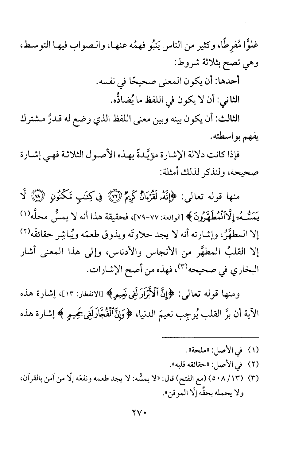 منها قوله تعالى: {إِنَّهُ لَقُرْآنٌ كَرِيمٌ (77) فِي كِتَابٍ مَكْنُونٍ (78) لَا يَمَسُّهُ إِلَّا الْمُطَهَّرُونَ} [الواقعة: 77 - 79]، فحقيقة هذا أنه لا يمسُّ محلَّه (¬1) إلا المطهَّرُ، وإشارته أنه لا يجد حلاوتَه ويذوق طعمَه ويُباشِر حقائقَه (¬2) إلا القلبُ المطهَّر من الأنجاس والأدناس، وإلى هذا المعنى أشار البخاري في صحيحه (¬3)، فهذه من أصح الإشارات.