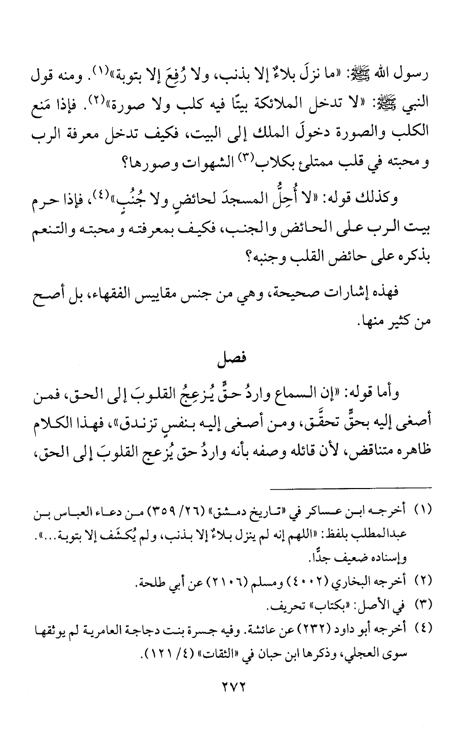 رسول الله - صلى الله عليه وسلم -: "ما نزلَ بلاءٌ إلا بذنب، ولا رُفِعَ إلا بتوبة" (¬1). ومنه قول النبي - صلى الله عليه وسلم -: "لا تدخل الملائكة بيتًا فيه كلب ولا صورة" (¬2). فإذا مَنع الكلب والصورة دخولَ الملك إلى البيت، فكيف تدخل معرفة الرب ومحبته في قلب ممتلئ بكلاب (¬3) الشهوات وصورها؟