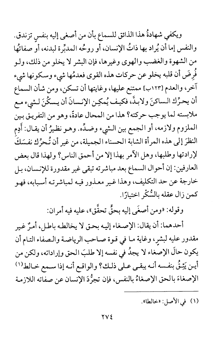 أحدهما: أن يقال: الإصغاء إليه بحق لا يخالطه باطل، أمرٌ غير مقدور عليه لبشرٍ، وغاية ما في قوة صاحب الرياضة والصفاء التام أن يكون حالَ الإصغاء لا يجدُ في نفسه إلا طلبَ الحق وإراداته، ولكن من أين يَثِقُ بنفسه أنه يبقى على ذلك؟ والواقع أنه إذا سمع خالط (¬1) الإصغاءَ بالحق الإصغاءُ بالنفس، فإن تجرُّدَ الإنسان عن صفاته اللازمة