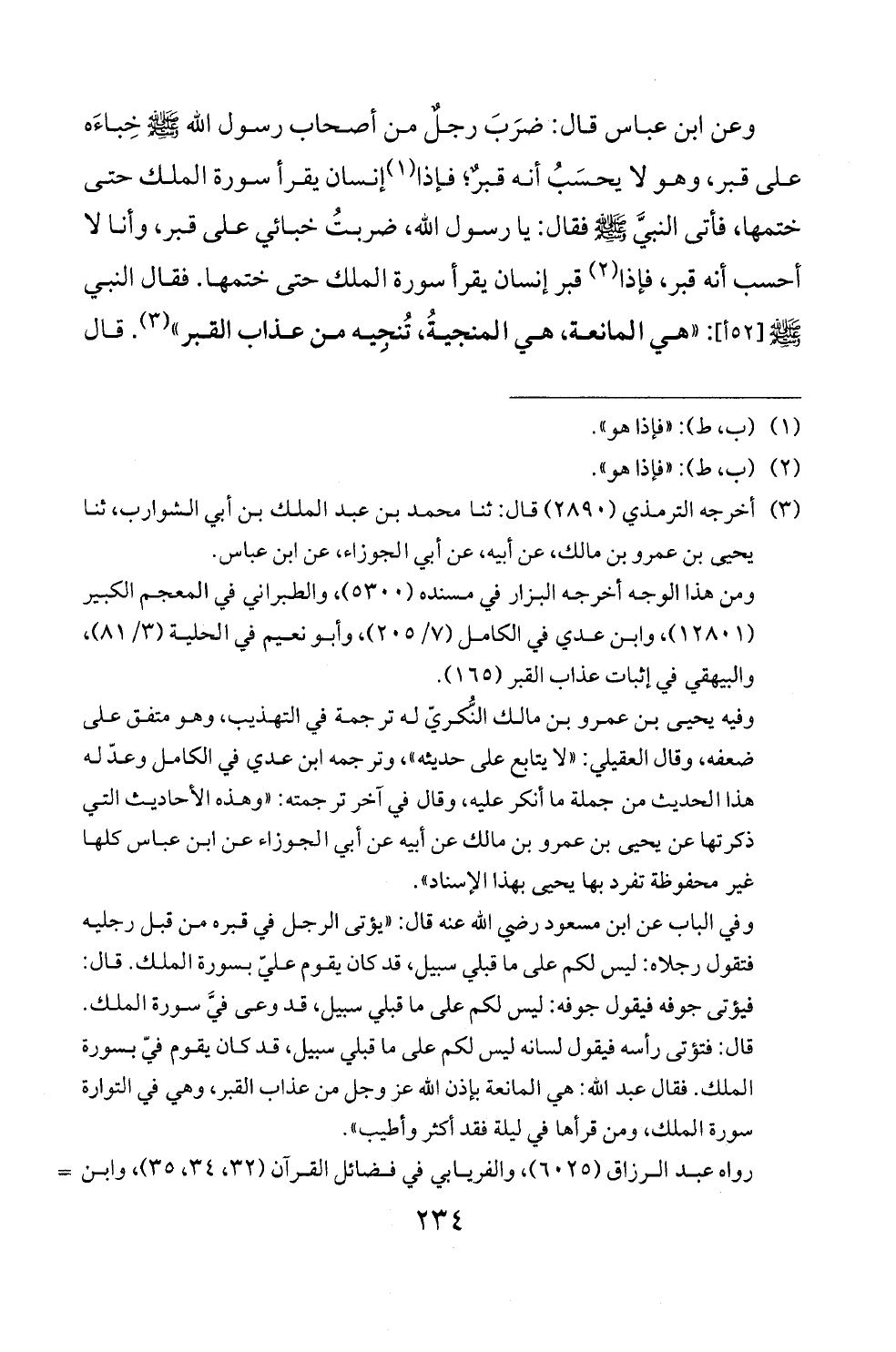 احسب أنه قبر، فإذا (2) قبر إنسان يقرا سورة الملك حتى ختمها. فقال النبي