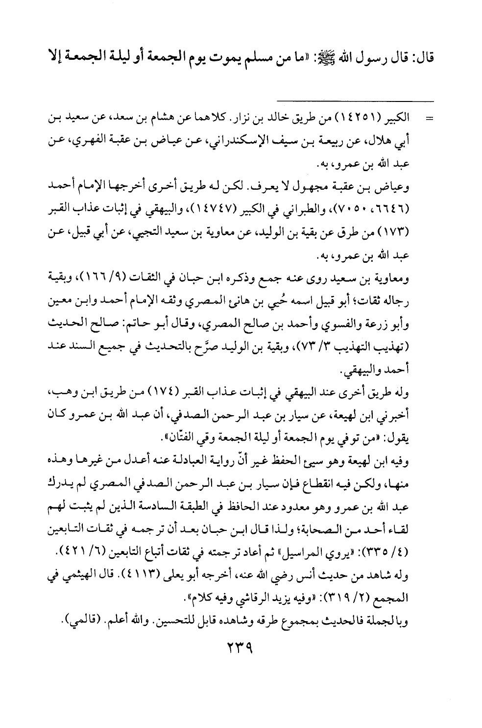 وبا لجملة فا لحديث بمجموع طرقه وشاهده قابل للتحسين. و دده اعلم. (قالمي).