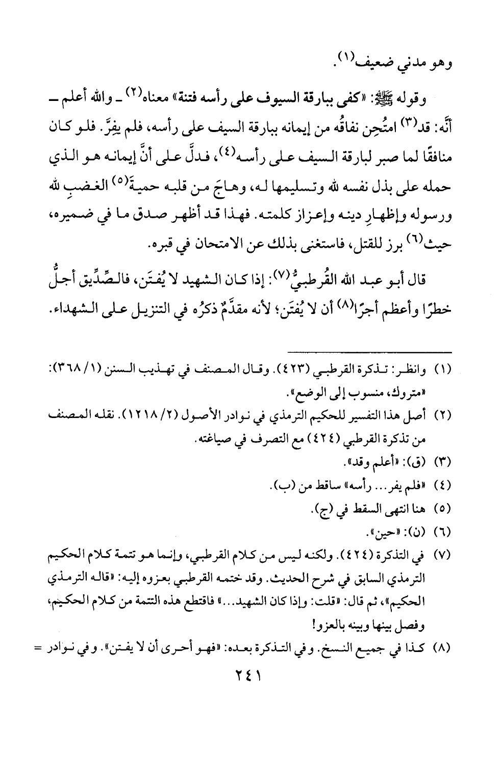 (7) في التذكرة (4 2 4). ولكنه ليس من كلام القرطبي، وإنما هو تتمة كلام ا لحكيم